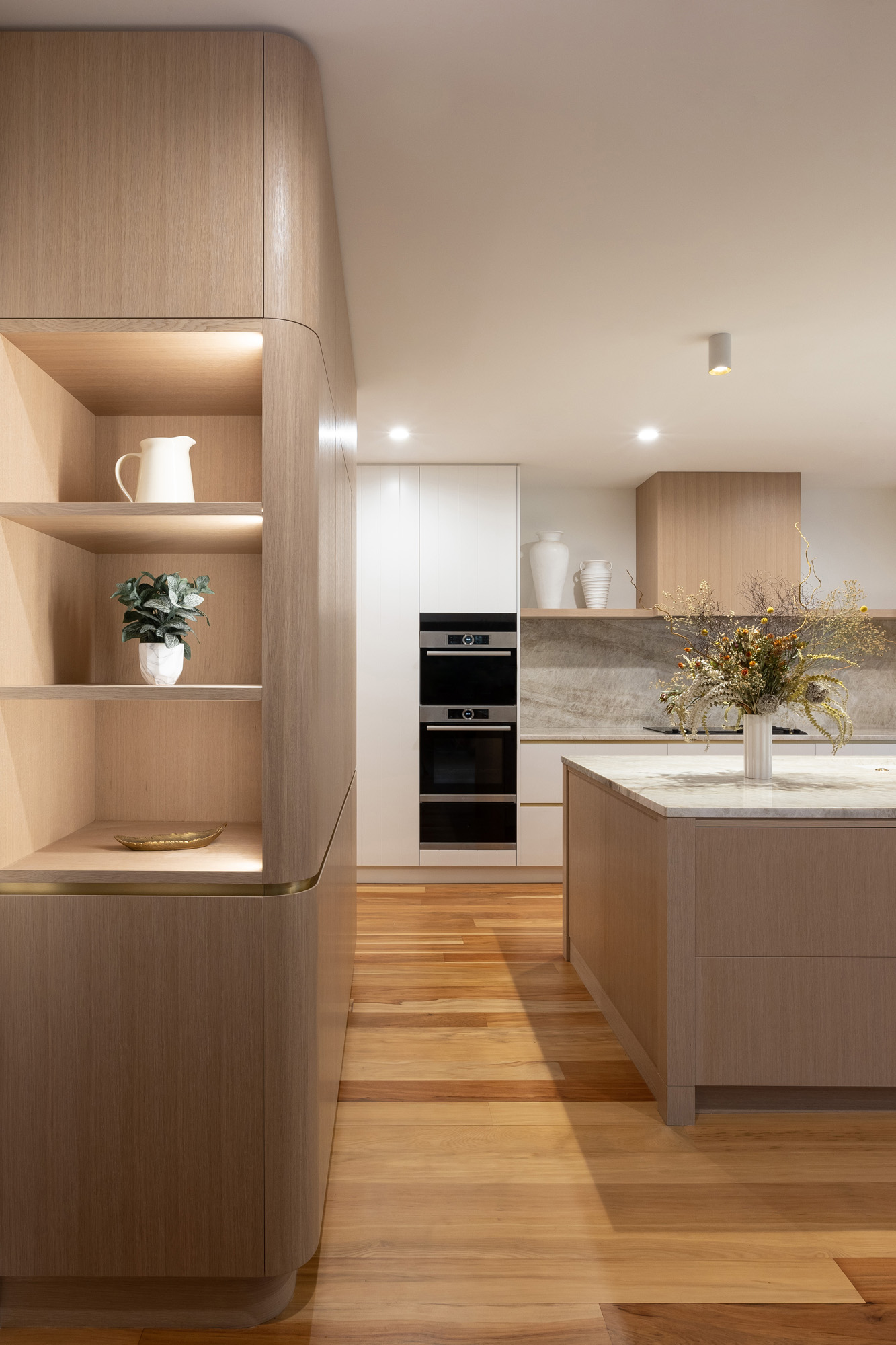 A great design is nothing without great craftsmanship bringing it to reality, and that requires excellent teamwork between designer and cabinetmakers. Curved doors with matching timber grain and curved custom handle details call for a special set of manufacturing skills.