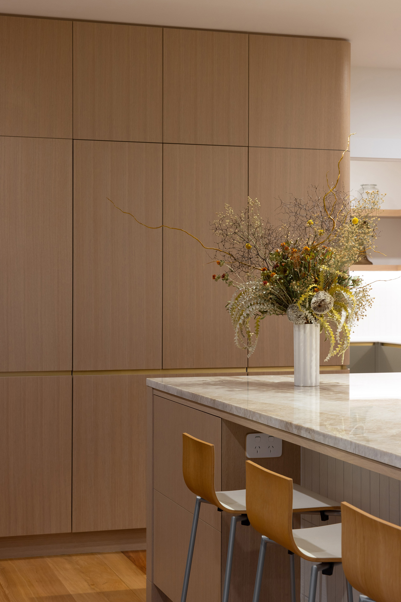 During the concept design phase, my client and I discovered we both love natural timbers and the colour green. I also love clean lines and integrated appliances. One of the challenges I set myself was to make the fridge visually disappear — we actually turned the fridge cabinet into one of the features of this kitchen. The integrated Fisher & Paykel fridge is hiding between two tall cabinets with curved doors and only one custom handle detail, with brass inlay running through horizontally. The bench seat bordering the kitchen on the living room side flows elegantly around the corner. Olive-green squabs match the green scullery fronts.