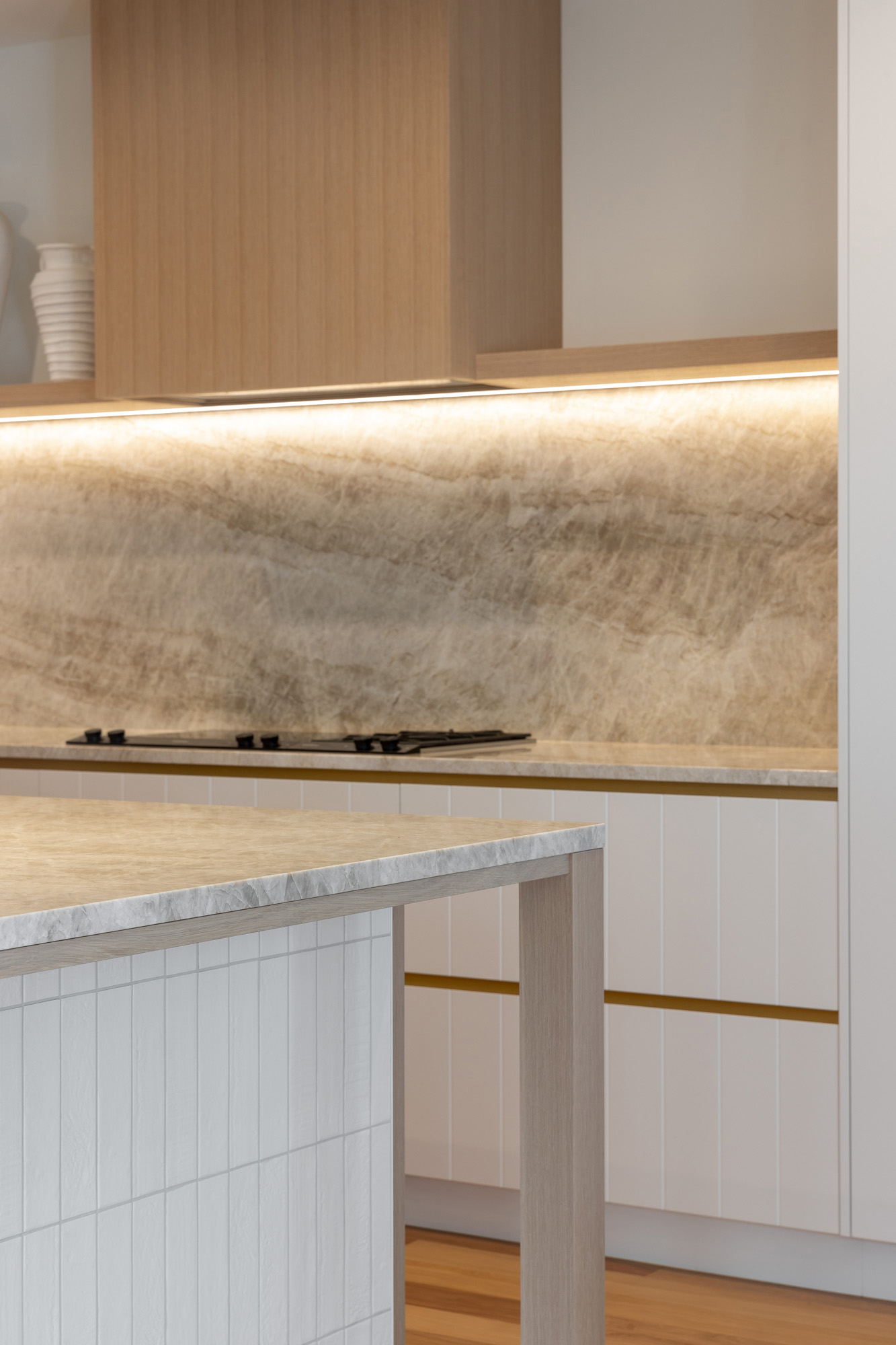 GF: [We used] the Sensa Taj Mahal stone from Cosentino. It was chosen not only for its beauty and warmth but because of its protective coating, which makes the natural stone very hard-wearing. It goes perfectly with the white and timber cabinetry. We were set on that stone from the very beginning of the project and it turned out to be an absolute stunner. We have used it on all the kitchen’s work surfaces, as well as the hob bench, island benchtop, and bar benchtop. We have used white sinks and brass tapware and handle details, and have also run the stone up the wall behind the hob as a splashback. The Taj Mahal is one of those stones you just want to hang on the wall as a piece of art.