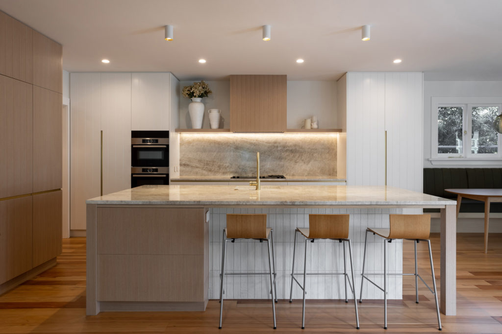 GF: The aim was to create a warm and functional kitchen for the client’s family. First inspiration was drawn from master chef Josh Emmet’s kitchen, which features warm timbers and benchtops. But, after a visit to the client’s house, it became clear that the new kitchen would have to have a tongue and groove pattern somewhere, as the existing house has tongue and groove details in the entrance and living areas.