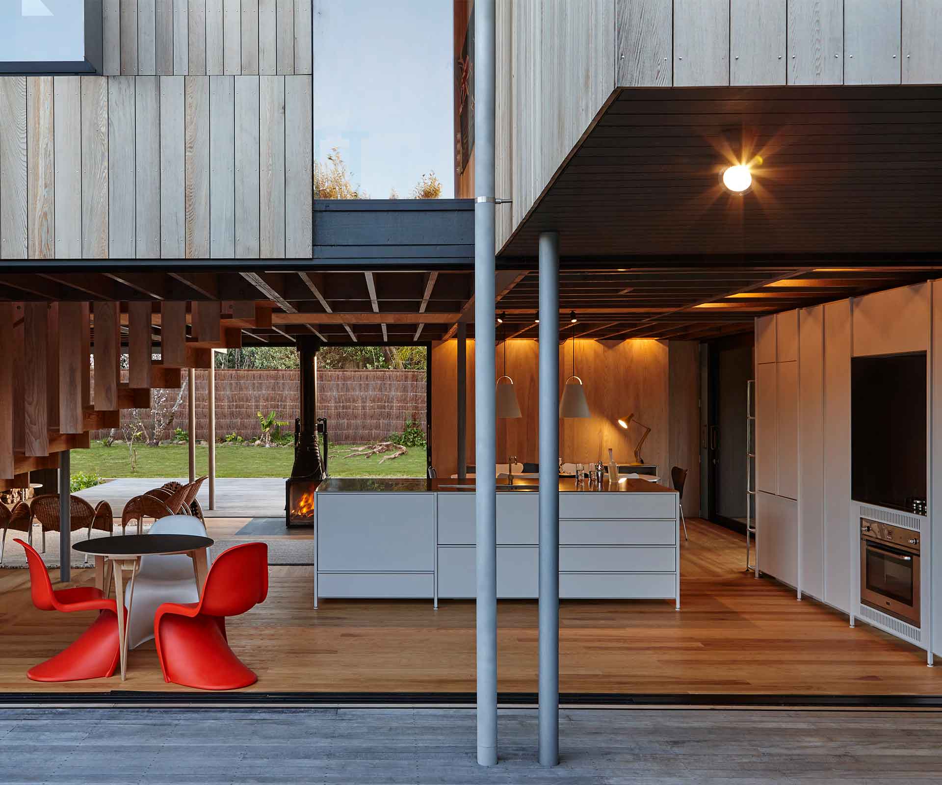 Kitchens are a focus in any house – but especially in a casual holiday home, they are a place where people gather to chat. The island is strategically placed to operate well for standing around and for preparing meals, as well as for eating indoors or outdoors.
