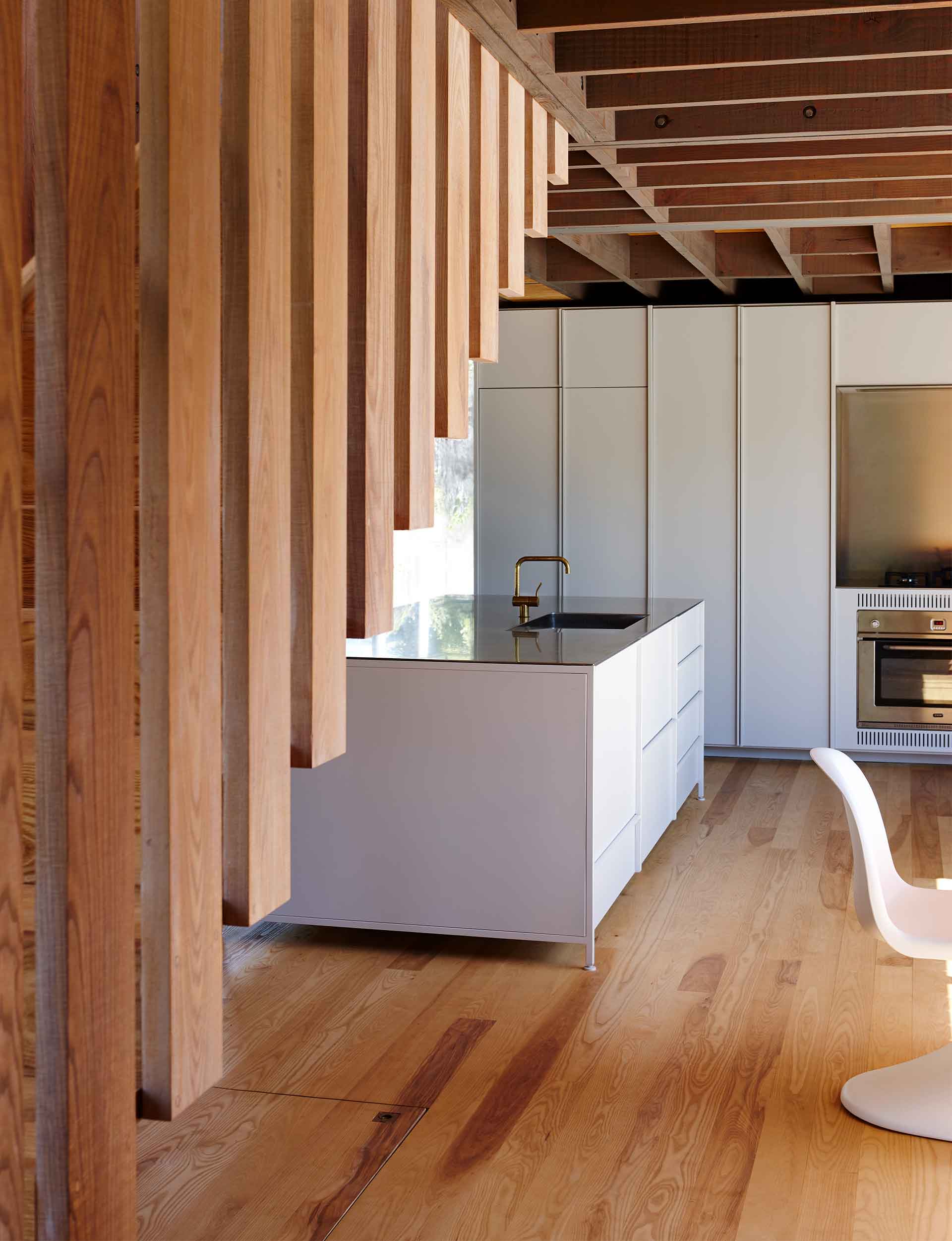 The combination of materials used in this Great Barrier kitchen was carefully chosen to achieve a simple and minimalistic design
