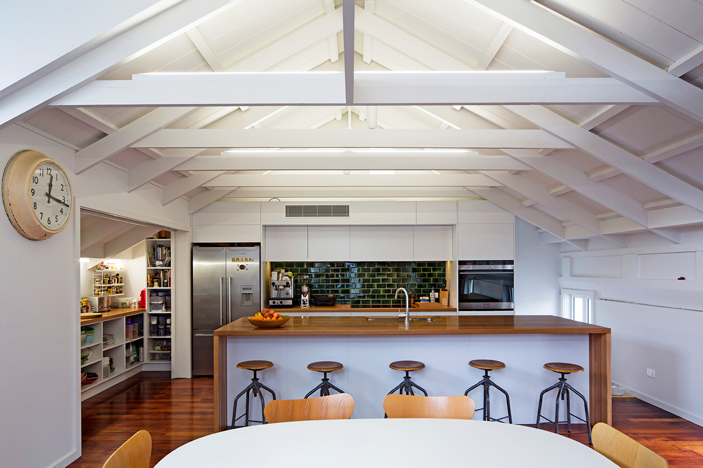 Richard Naish, RTA Studio The existing building did provide some challenges. It had very low stud height at the wall roof junction so we utilised this space for pantry storage and shelving.