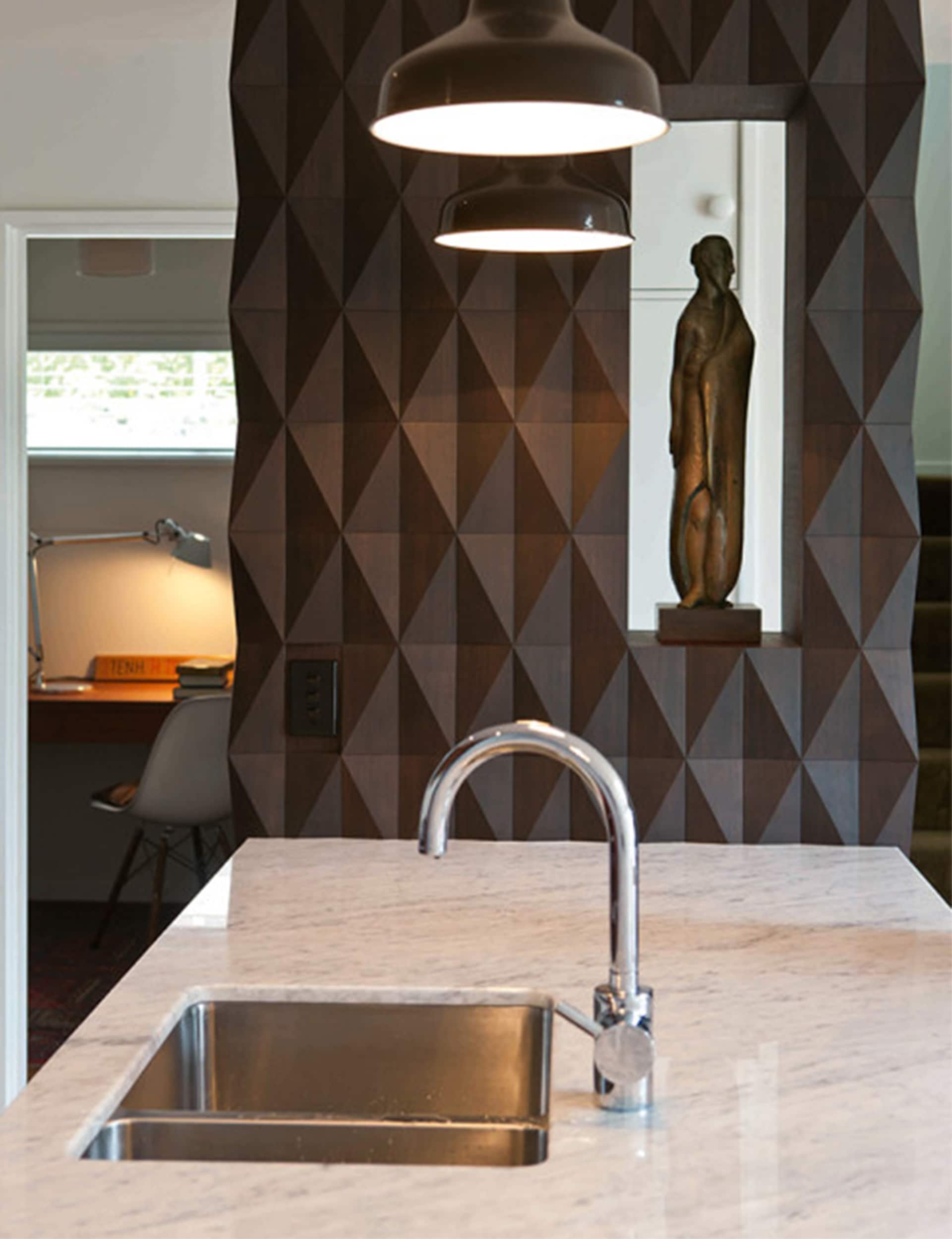 Belinda George It was designed to hide a structural column and part of the concrete block wall that supports the home’s upper storey. The wall is a real focal point. It’s the first thing you see when you enter the house and provides a separation between the entry and kitchen. It’s a pattern and texture that David worked out through gluing a series of 1:1 samples to an MDF substrate.