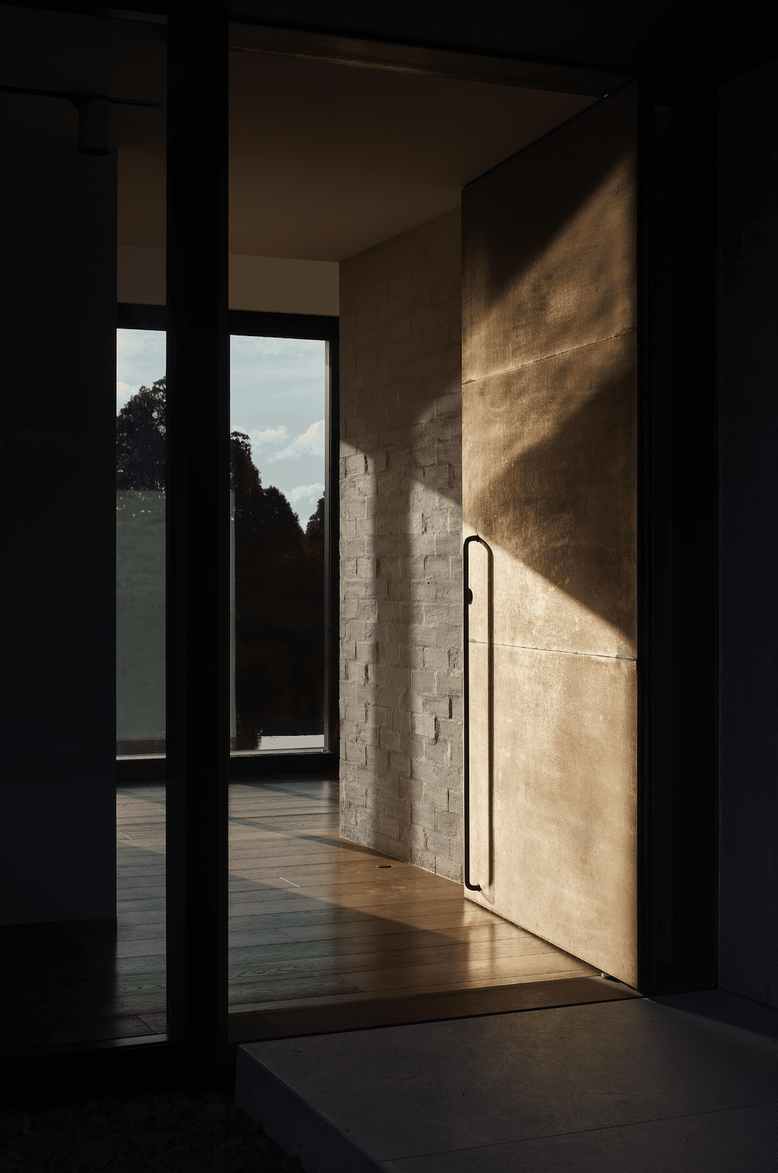 The entry sequence includes a small gallery hallway that adds a touch of magic to the space. Brass accents throughout the house — including a stunning pivoting door — will eventually develop a patina.