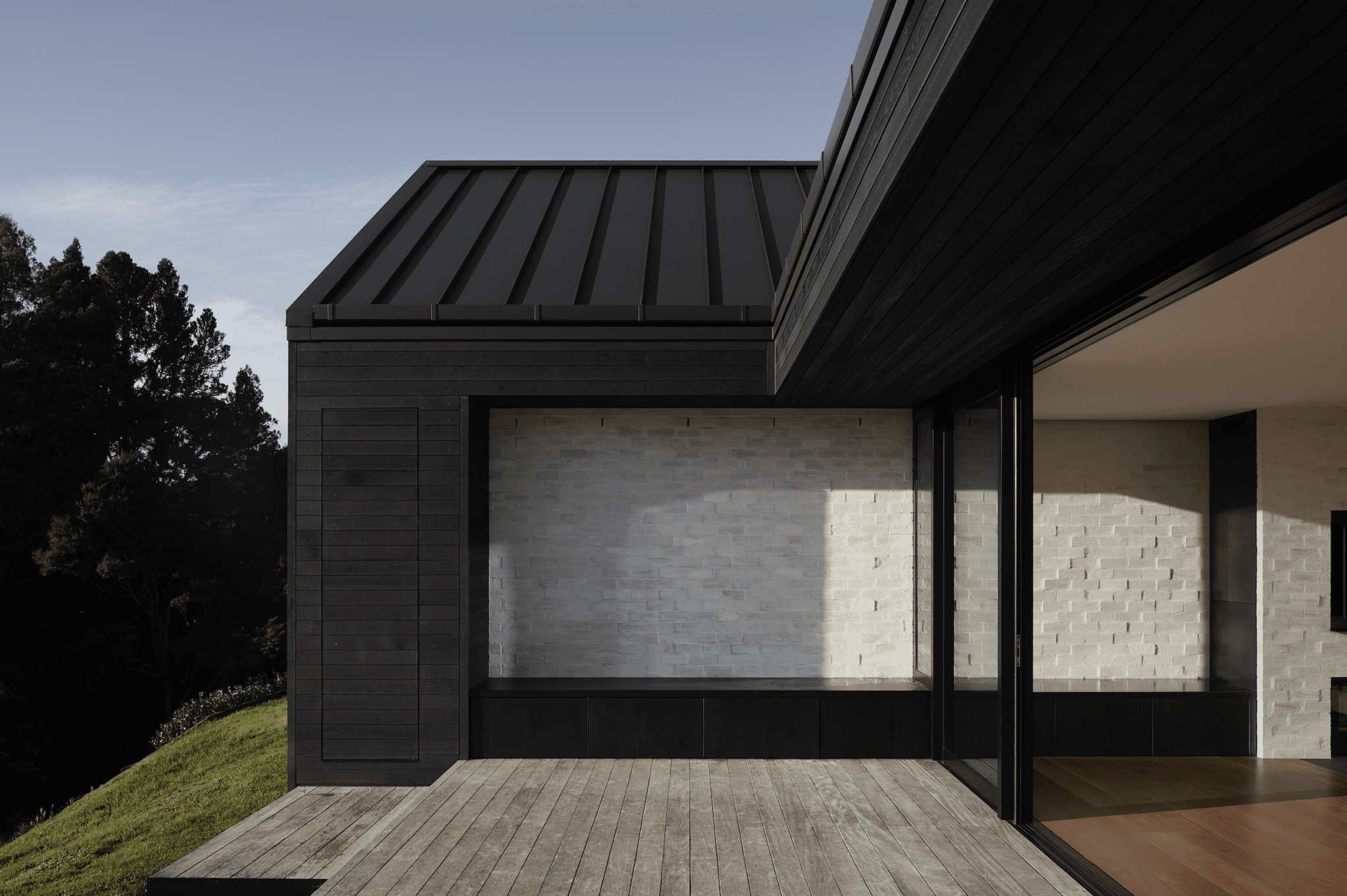 Firewood storage is hidden behind a secret door that almost perfectly blends with the façade. The cedar planks are held together crisply on the centre of the gables by a single flashing.