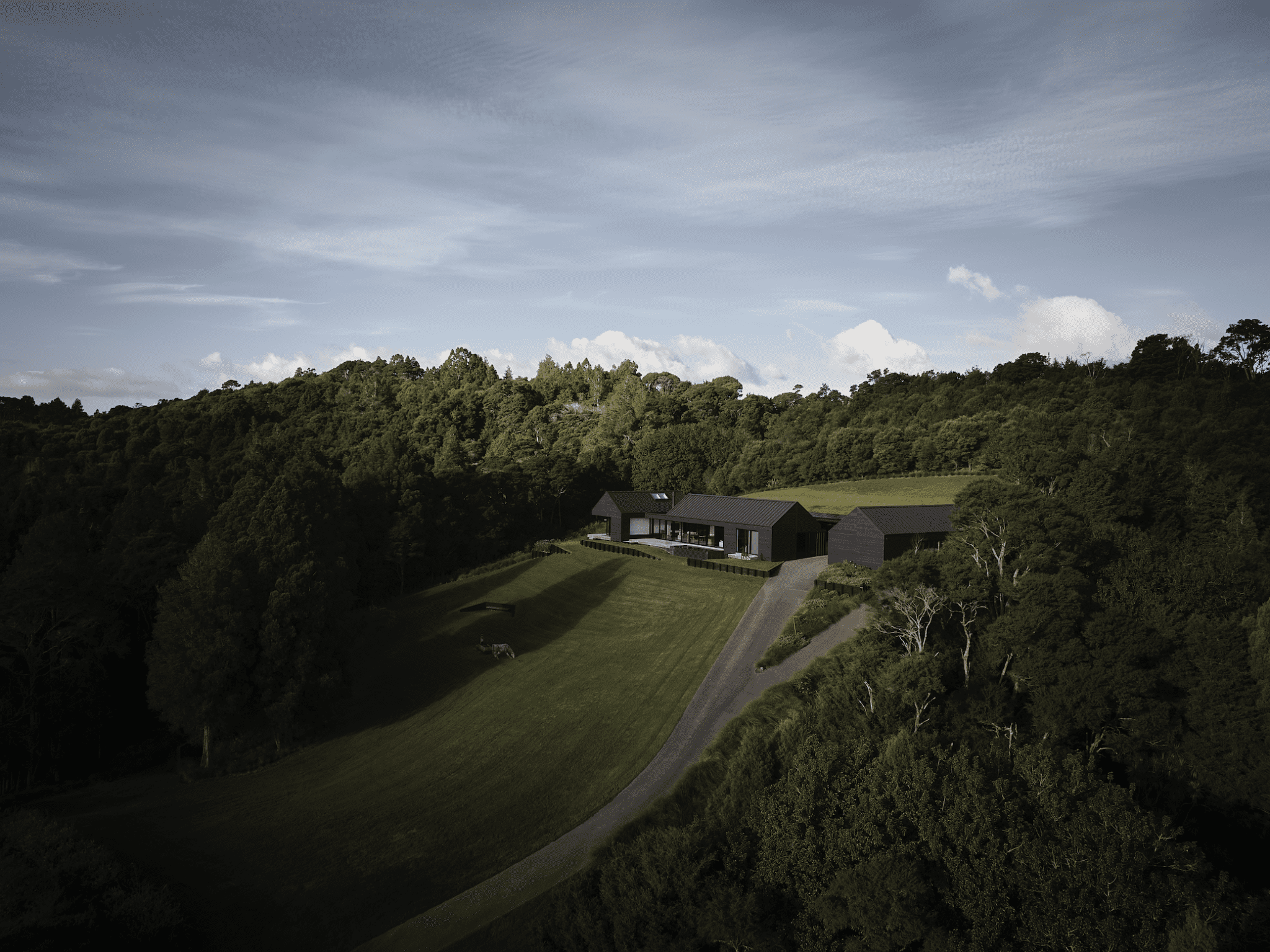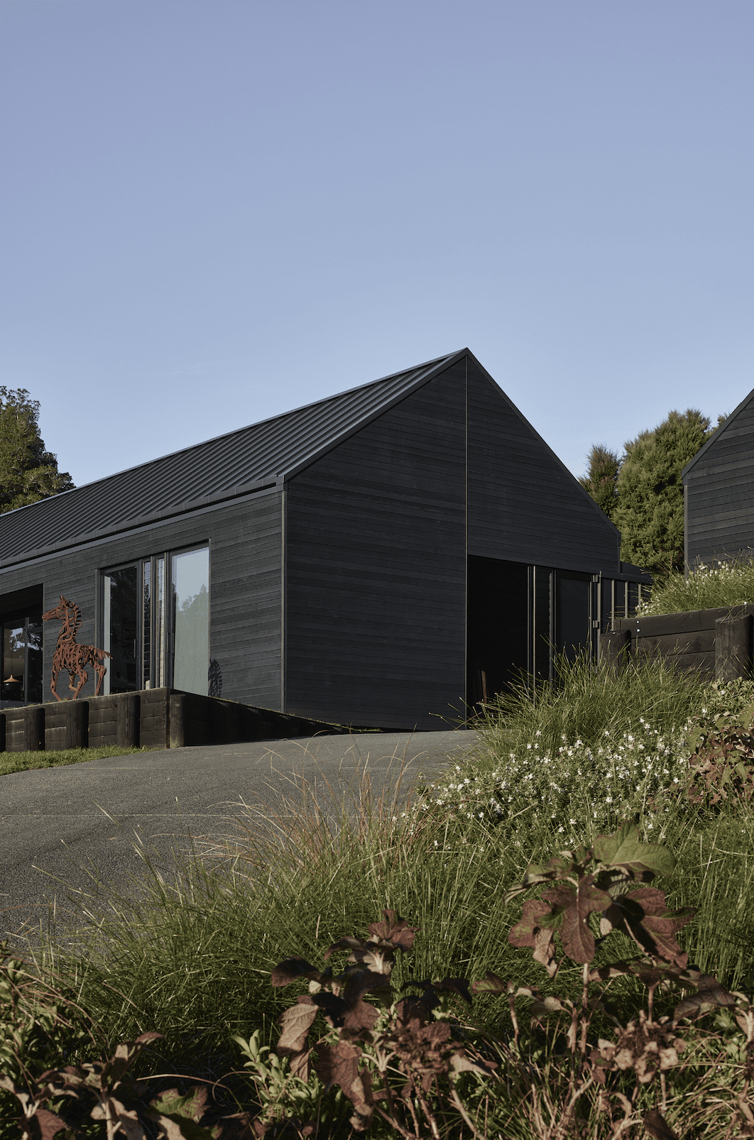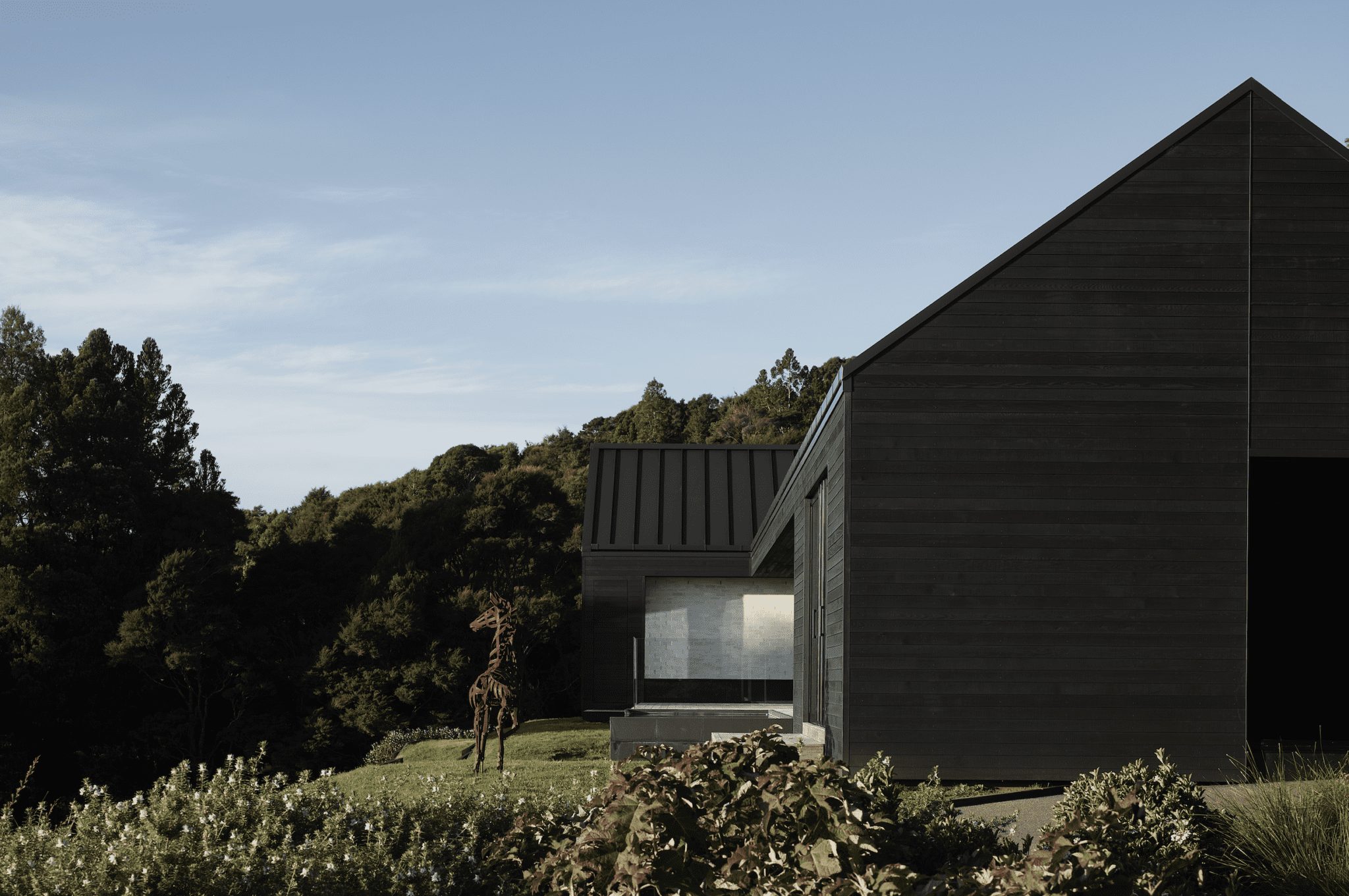 The drive up to the new house involves manoeuvring along a steep driveway that splits into two shortly before arrival. It was a little lower on this hill that the owners built a large family home many decades ago. They got deeply involved with regenerative native bush planting the large section, carving DOC-inspired trails around the site, and populating much of the land with outdoor sculptures.