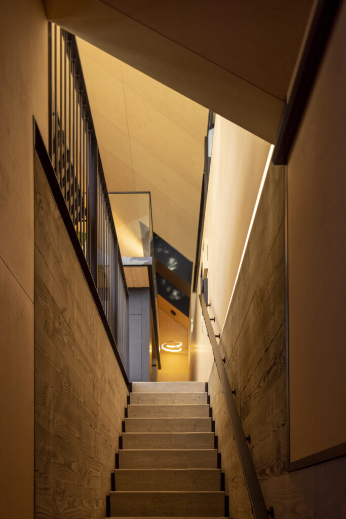 “A strip window to the north snakes up to the skylights at the rear of the building and feeds into the black skylight reveals. You can also see one of the skylights from the bottom of the linkway stair, so you’re really drawn up and into the space from the entrance.”