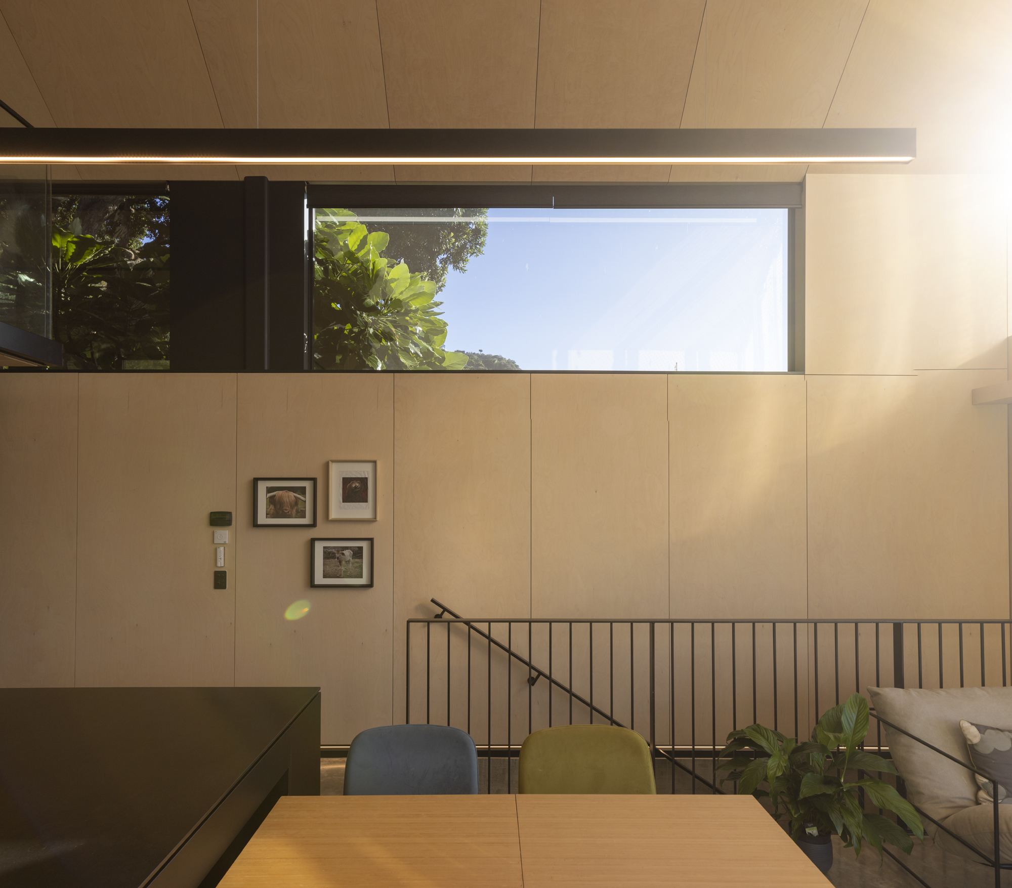 Skylights at the western end of the addition draw light into the mezzanine bedroom; one of them frames views through the pohutukawa so “you can sit in bed and look up to the sky through the tree”. Here, Alain says, the expressed lines of the birch ply wrap up and around the ceiling, but also horizontally, to meet the skylights.