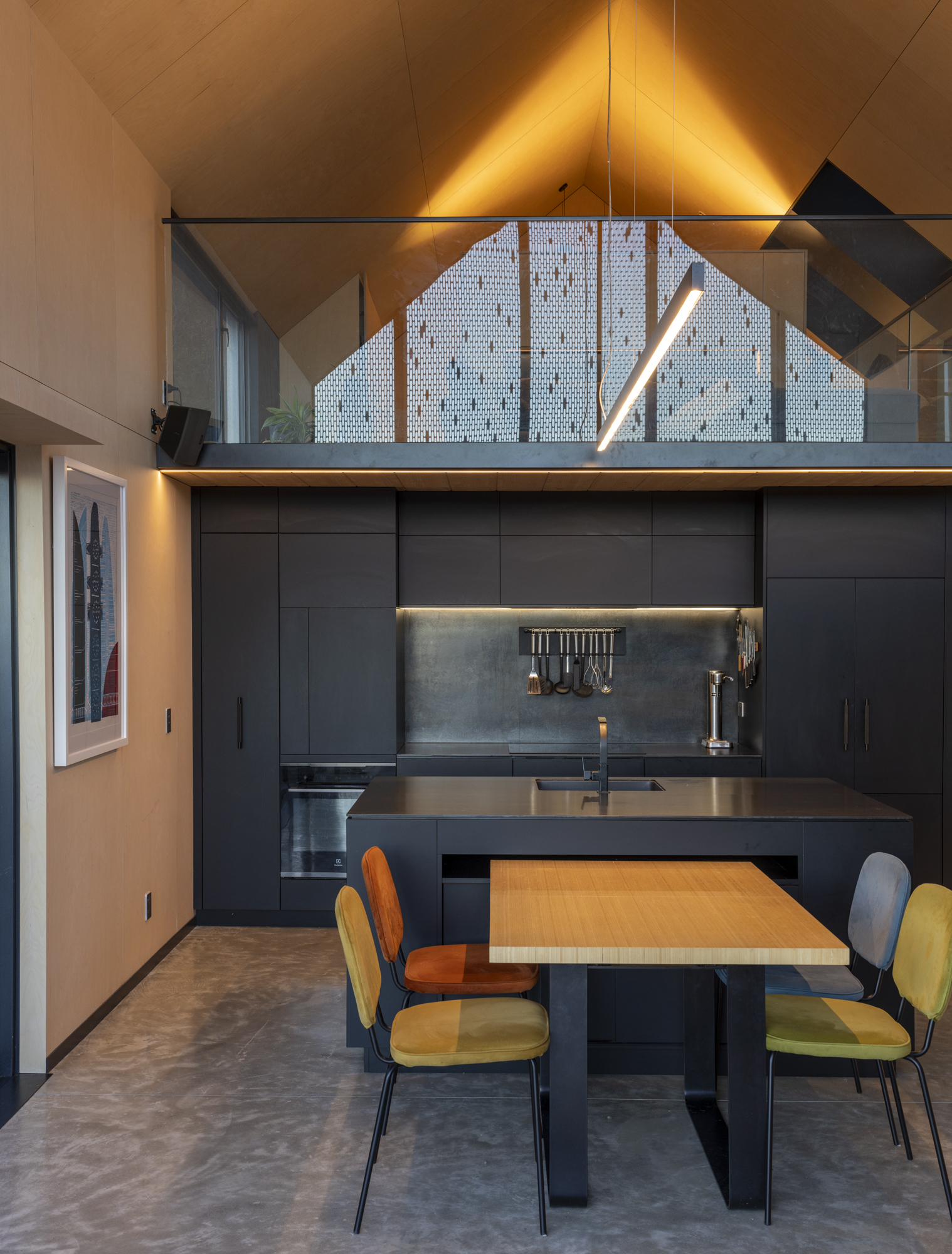 The mezzanine floor is crafted from solid timber, 100mm-thick glulam tongue and groove boards that allowed for the mezzanine to cantilever out and become the kitchen ceiling. The kitchen itself is dark and recessed — a contrast to the beautifully mottled concrete floor and lighter toned birch-ply walls. Here, a black soft-touch Melteca was selected for the cabinetry while a blacked steel splashback continues the moody allure of the space. A large island was designed with custom cabinetry and a slot at its front, into which the dining table fits — one of many space-saving techniques utilised in this project. Overhead, a blade light from Moth Light is both an uplight and a downlight, which means the raked ceiling can be illuminated for a softer light, or the downlight used for task lighting when required.
