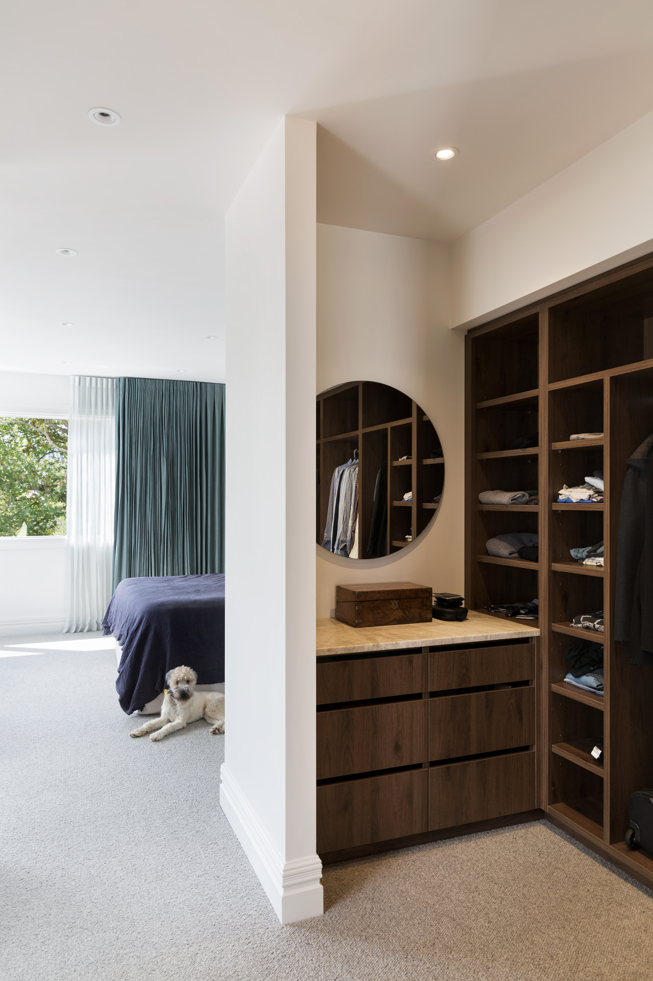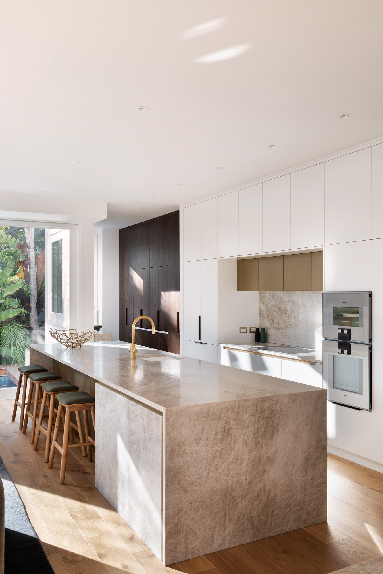 In fact, stone provided a stimulus for much of the design. Taj Mahal, an incredibly dense quartzite, in a colourway that felt very earthy, became another catalyst. It makes a serene statement on the island bench and elsewhere throughout the home. Up close, it has tones of chocolate brown, which Chantelle picked up in some kitchen cabinetry. The brass-painted surfaces on the splashback and front of the island also key into its striations.