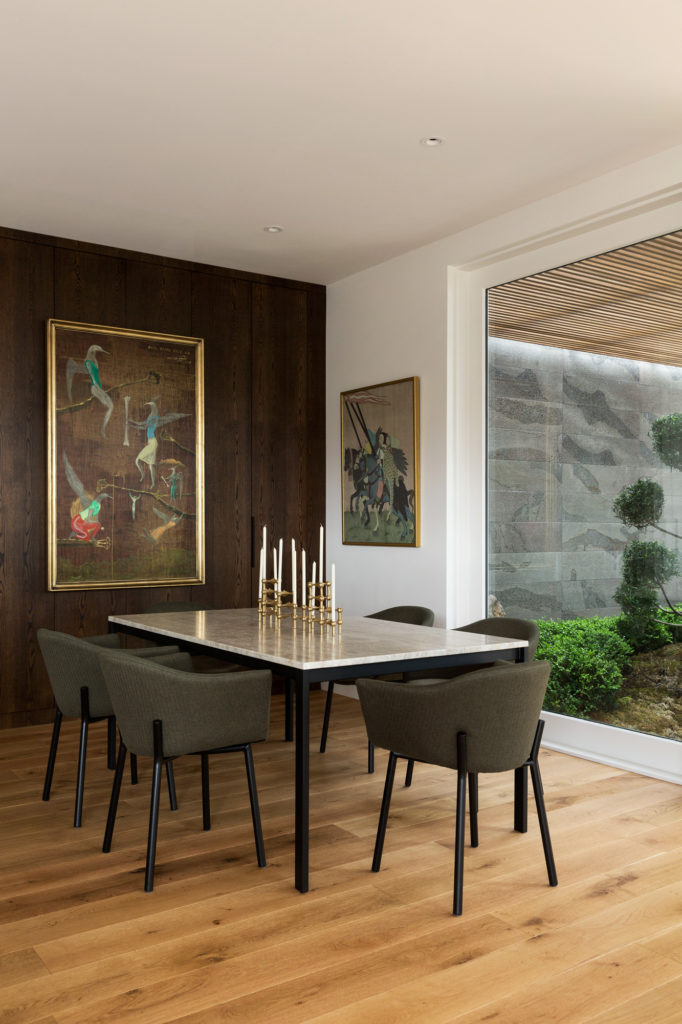 The dining area gets a good view of the interinal garden, and artworks here are a 1970s work bought by the owners's father, plus Bill Hammond's 'Over Gold Green Sea'. Upholstered in an olive-tone fabric, the Felix Chairs are from Simon James Design