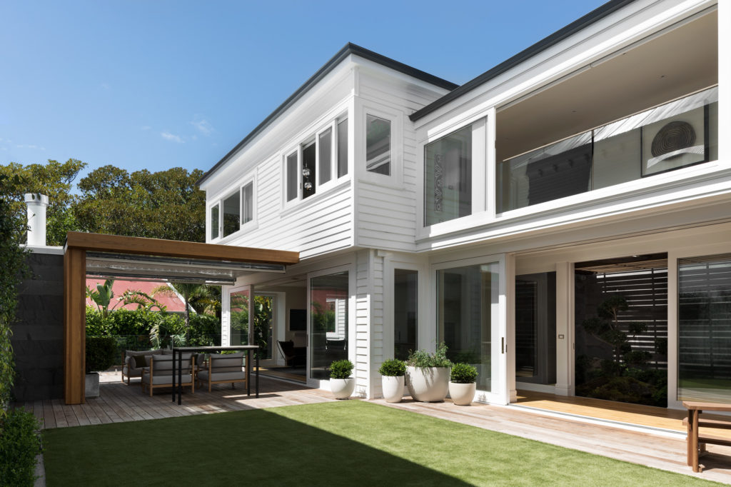 This Freemans Bay new-build was designed to meld with the colonial character of the neighbouring home; perched in the garden is an 'Owl' by Rachel Silver