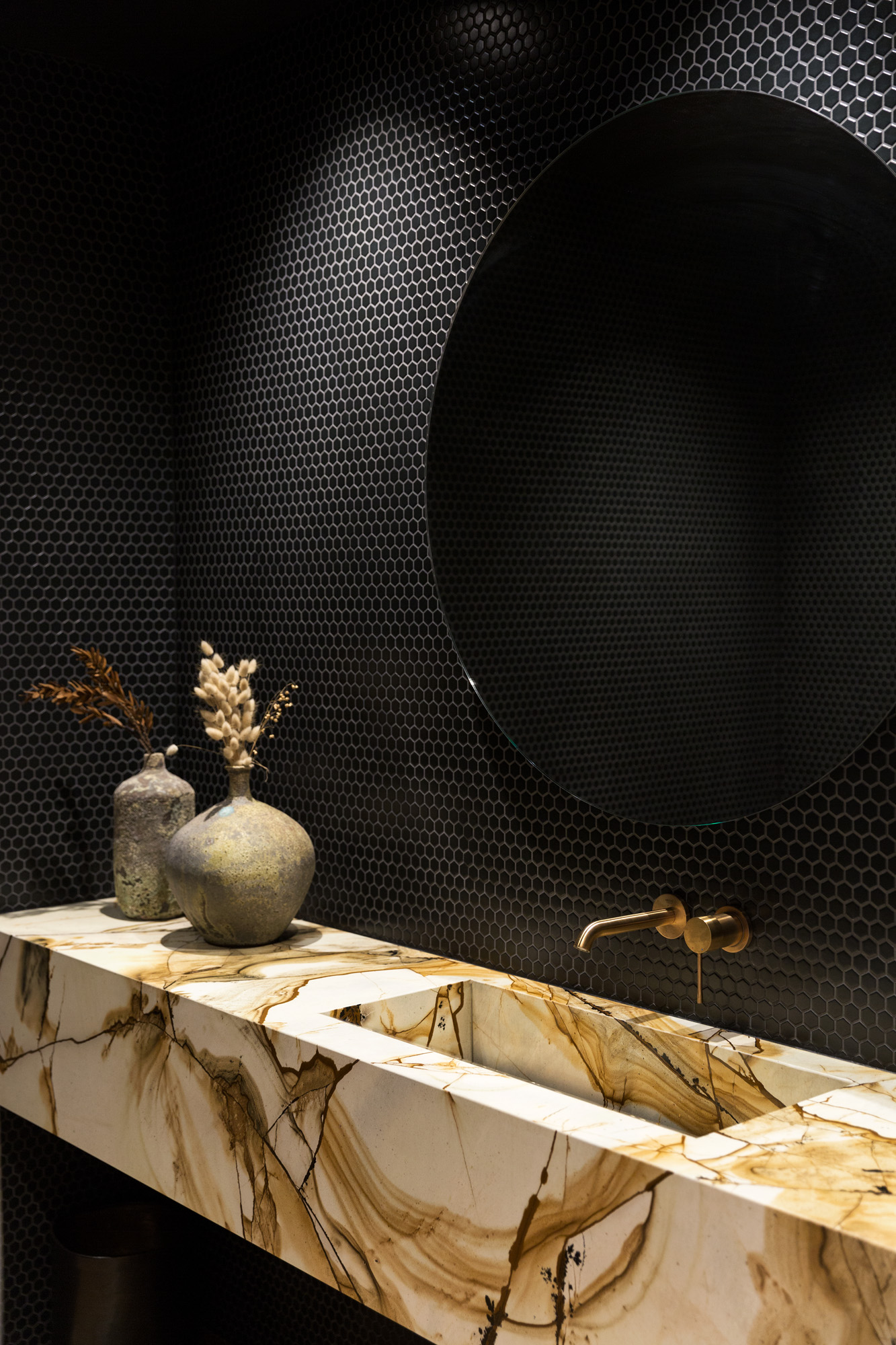 Its yellow-brown swirly grain is distinctive and dynamic, and black flaws in the stone were the cue for the dark hexagonal wall tiles used as a contrasting backdrop to make this small space sing.