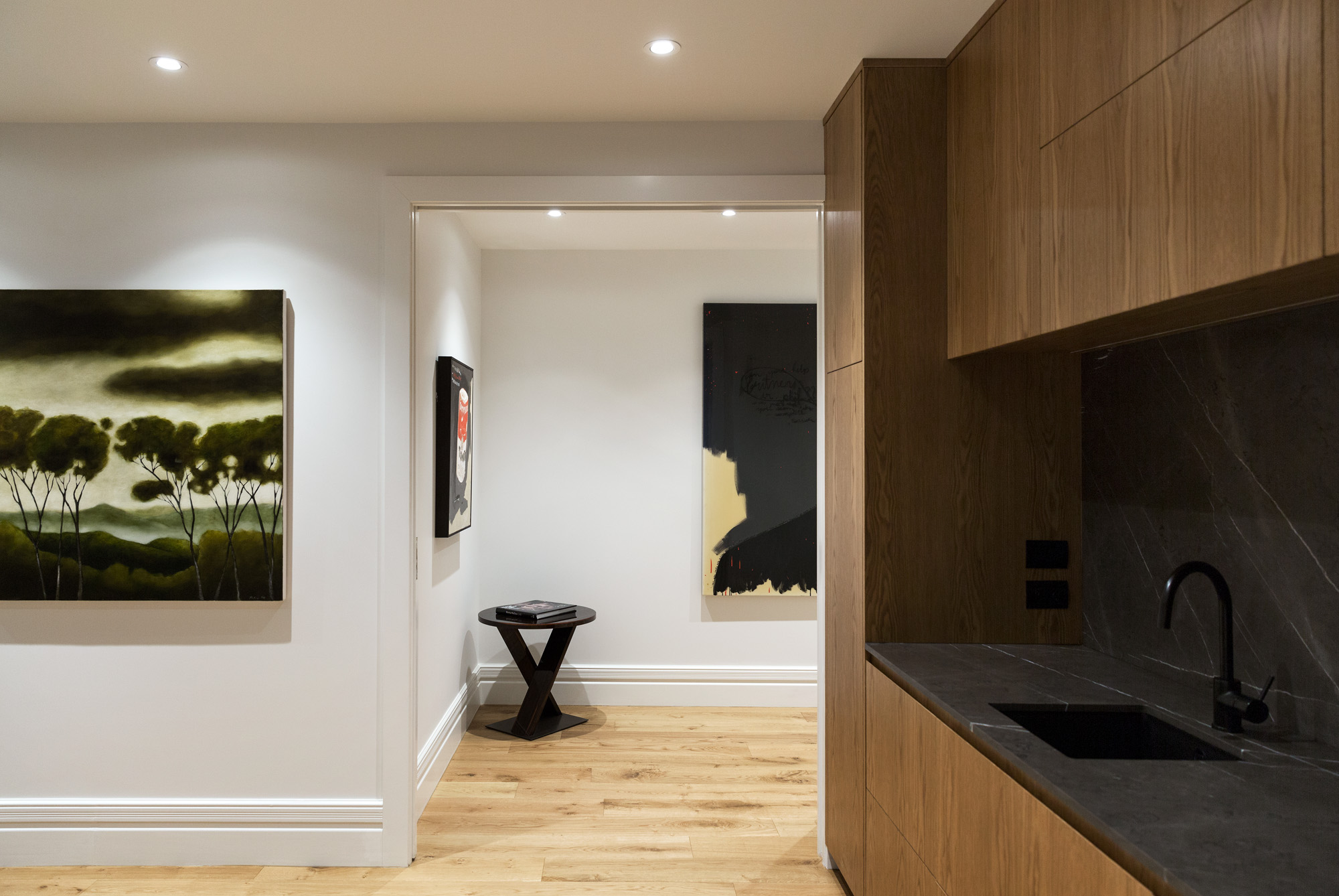 Tapware in warm metallics, wool carpets, and oak flooring are a natural base that allows the material to be celebrated, but this is punctuated by furniture upholstered in shades of forest green, navy blue, and red wine. Then, of course, there’s the art. It speaks volumes from every corner of the generous abode. Simon is an art aficionado — some might say addict — and admits that, in his previous house, the walls became a little cramped.