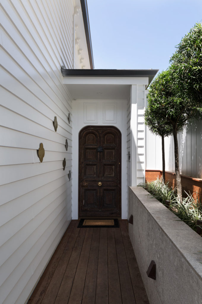 Tucked down the southern side of the dwelling is the entrance, made decorative with Max Gimblett quatrefoils. The solid kauri front door was bought second hand and left, unstained, in its original condition