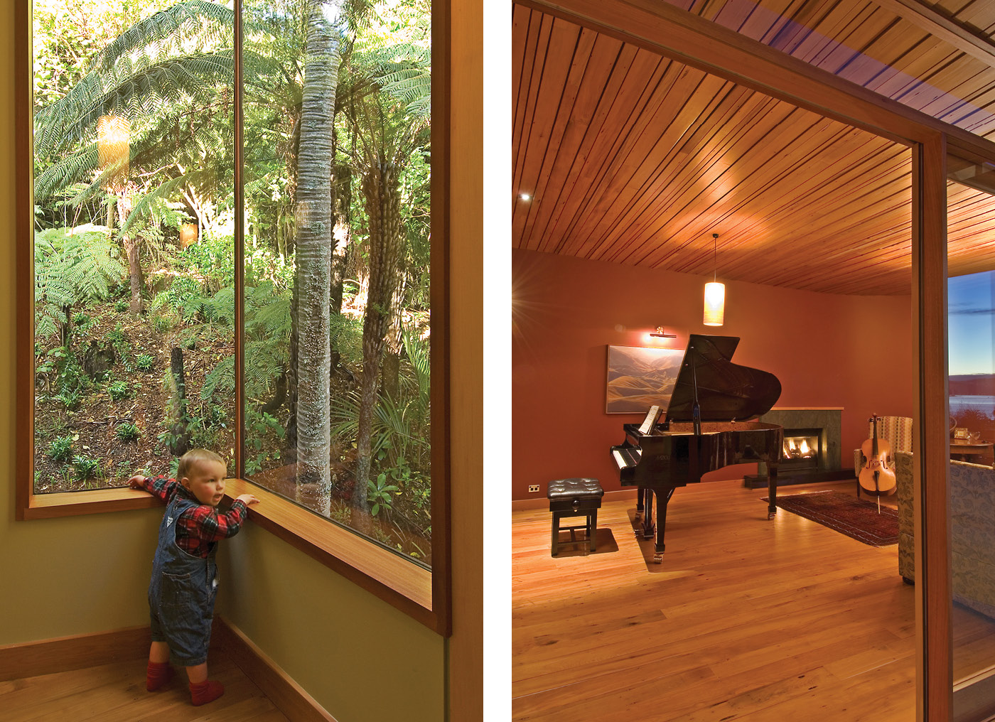 The house may be, as one of the owners says, a “servant of the site”, but it is not a simpering sort of servility. Tennent wanted to honour New Zealand’s European legacy of painted houses in gardens, so he grounded the living pavilion with solid, painted block walls that run from outside in and west to east and emphasise the connection between the front and rear of the site. After this show of strength, the other parts of the home, clad in stained macrocarpa, can comfortably recede into the trees.