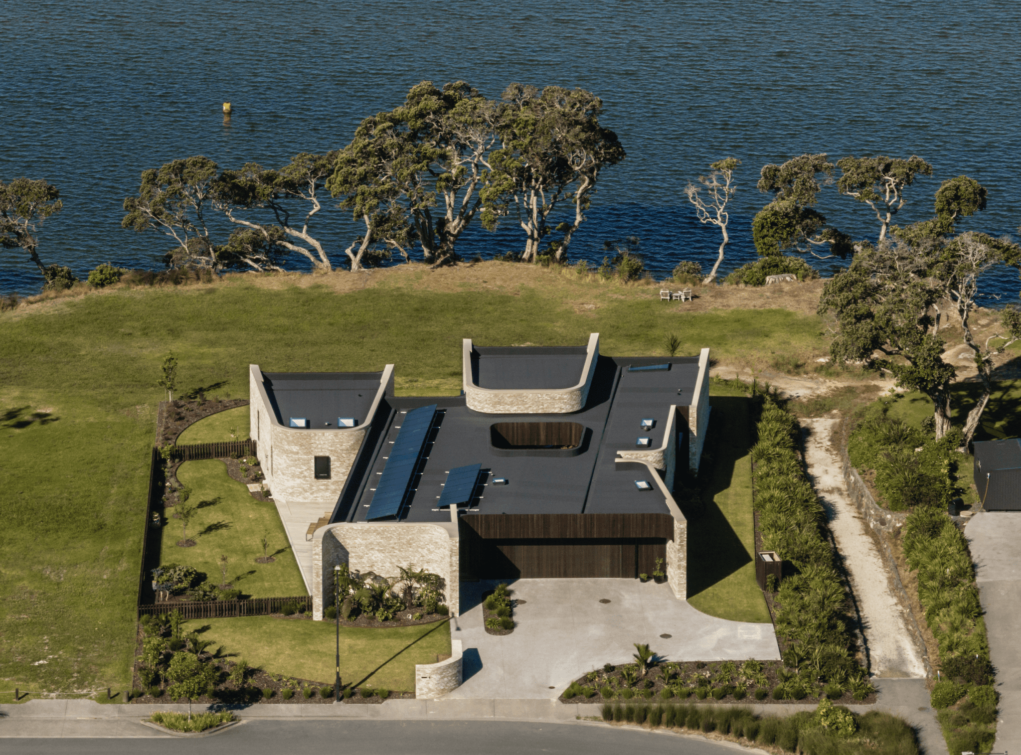 Moving between sweeping curves and overt gestures of permanence, this Mangawhai home opens up and reaches out to the estuarine landscape beyond, welcoming visitors and the view with a dynamic spatial interplay.