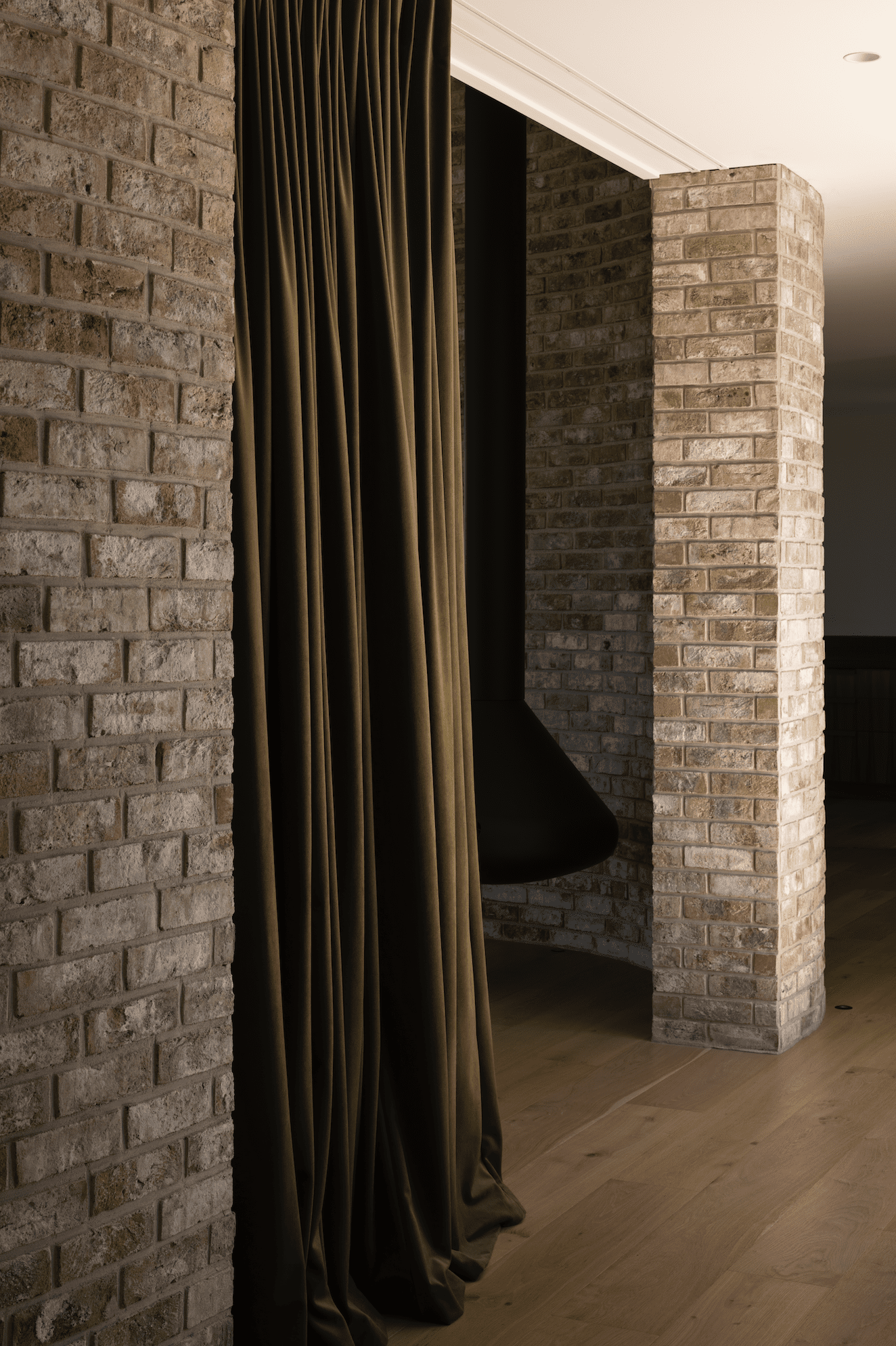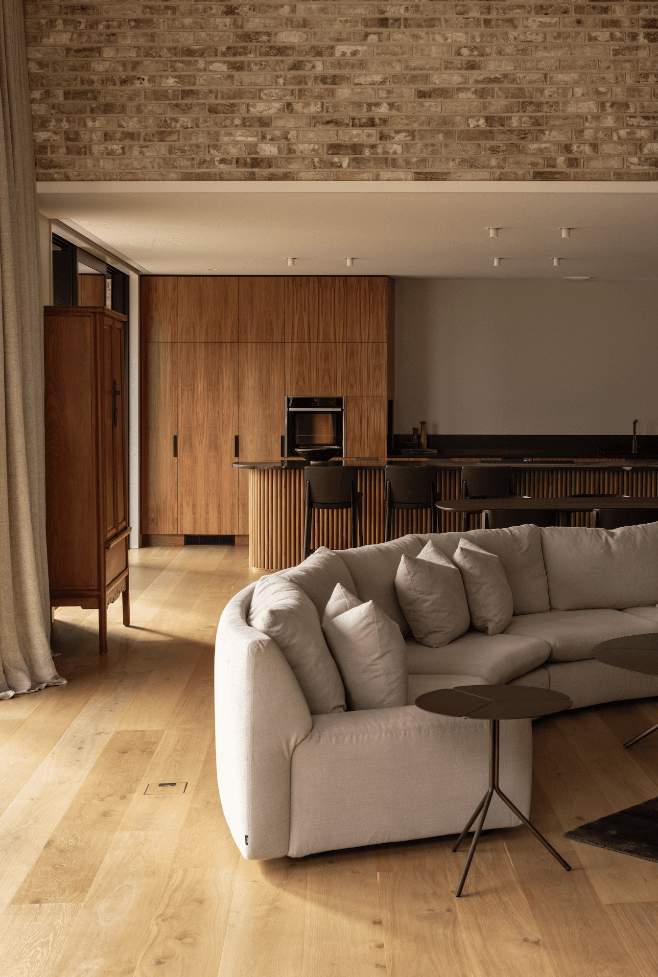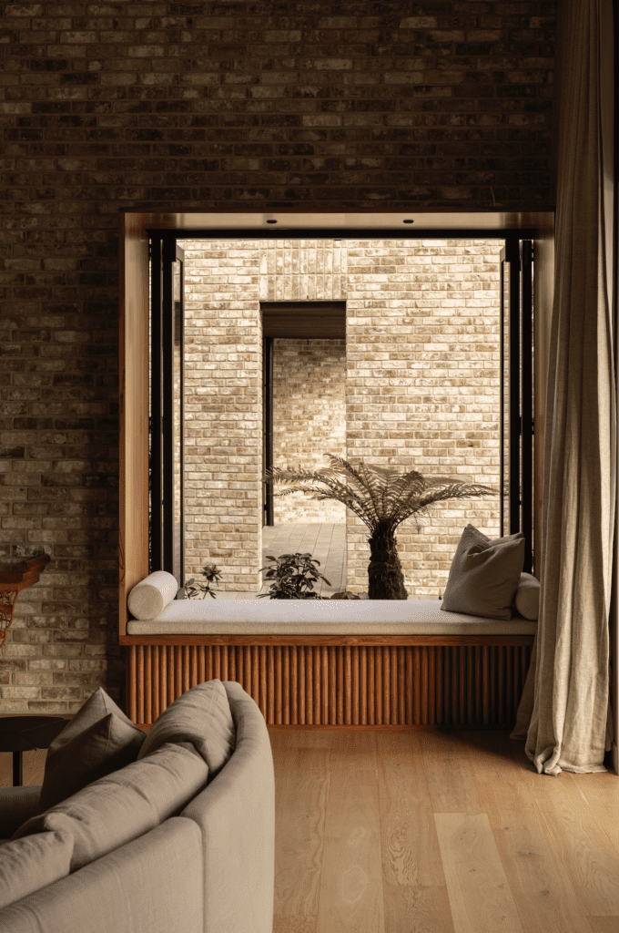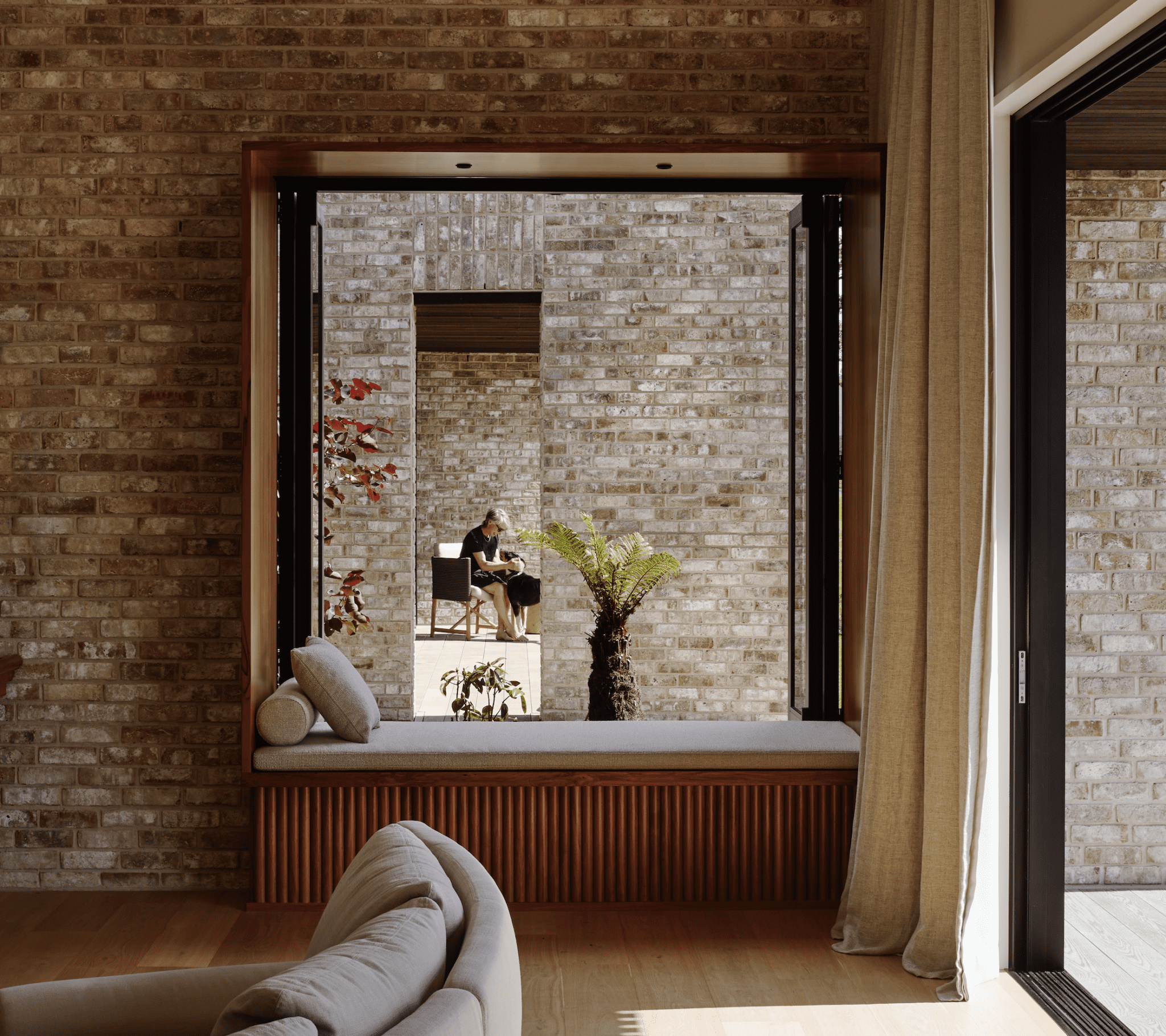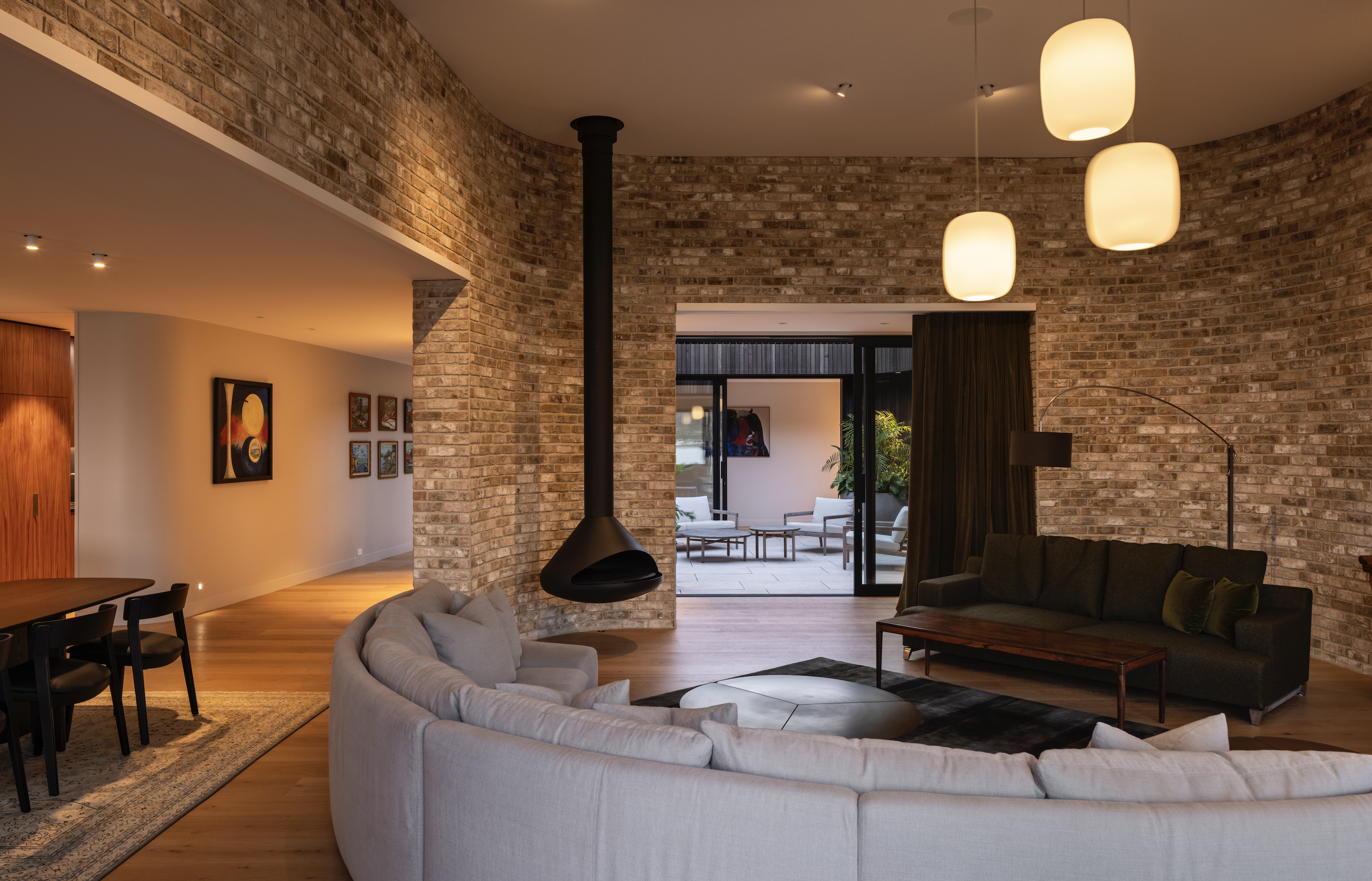 “The central open courtyard became the first solid object, around which flowing spaces are interconnected,” Belinda tells us. “The curving brick walls form the next aspect of solidity, and balance the fluidity of the spaces around them.”