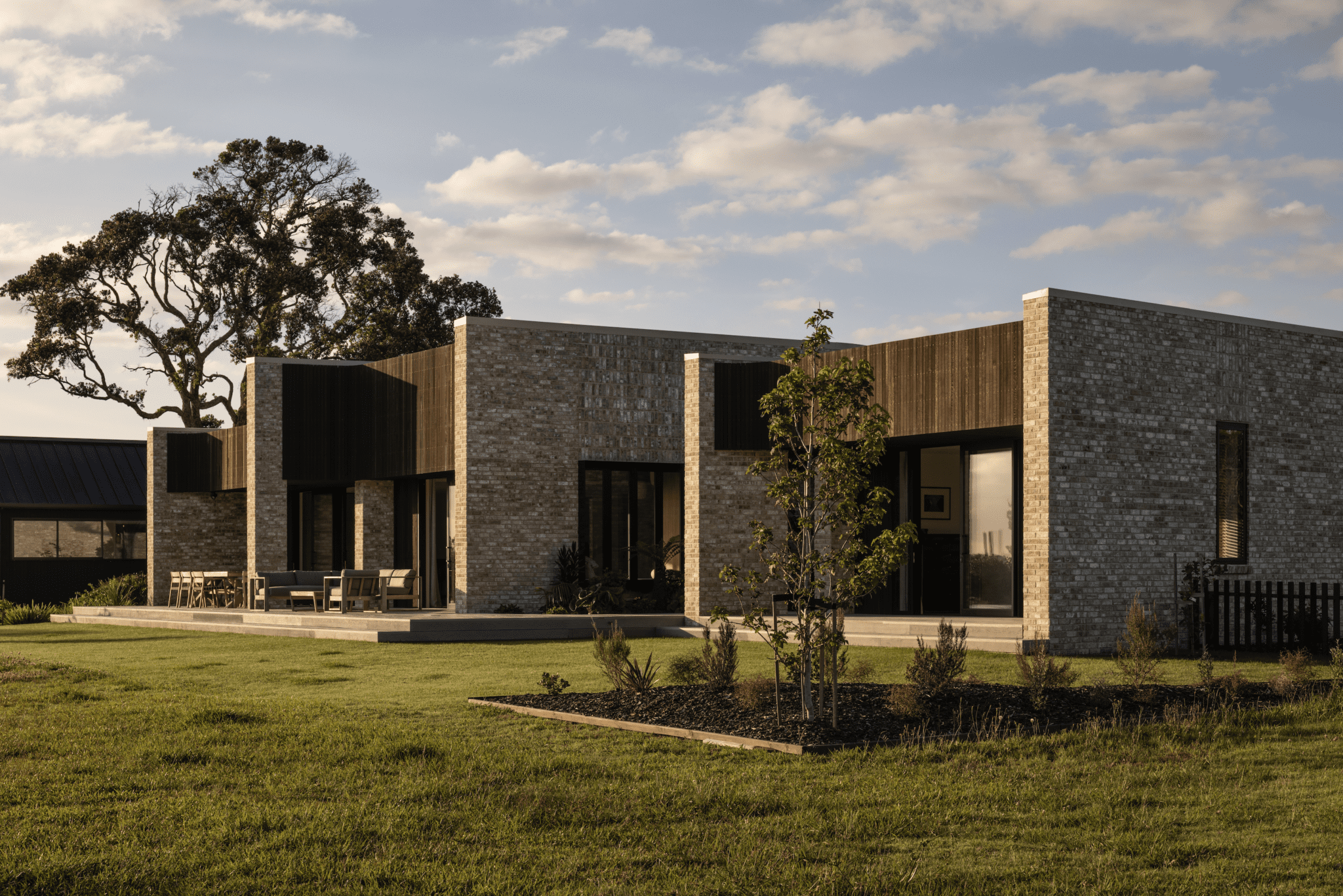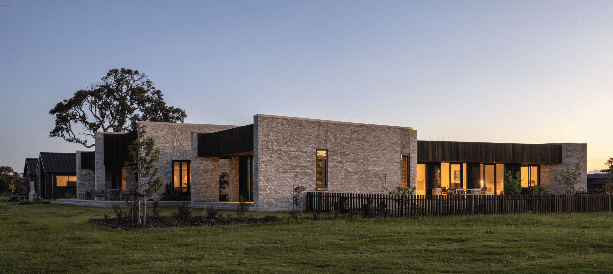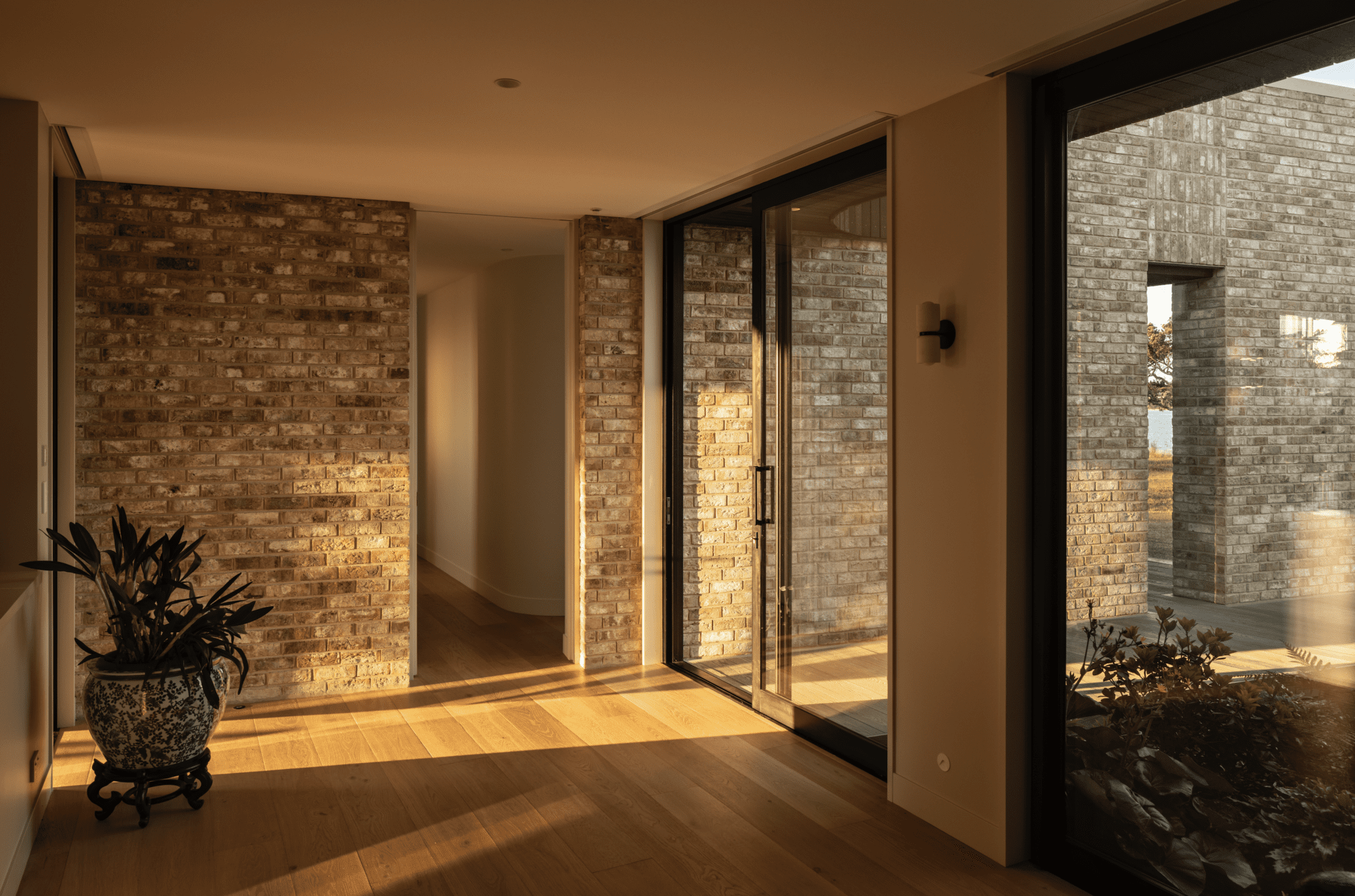One of those was envisioned as a gallery, an area designed to be sparsely furnished — a place to pause and connect with the foreground, middle ground, and distance to this layered landscape of built and natural forms. Here, full-height glazing draws the eye across lush planting accentuating the external brickwork, beyond to the pōhutukawa-lined bank, and across the estuary.