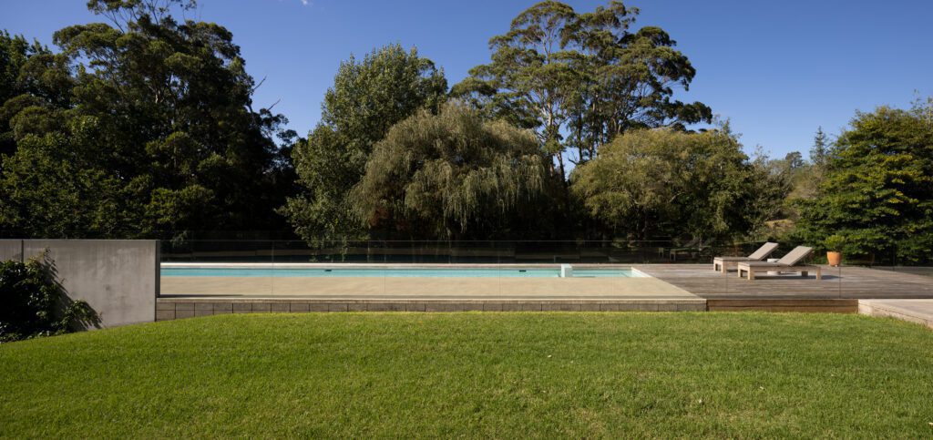 On one side of the pool, timber decking draws parallels to the horizontal boards of the cladding. On the other side is PeterFell 137 coloured concrete, a warm-toned grey that accentuates the textural qualities of the material. Here, it offers an almost Mediterranean aesthetic — alluring but with a sense of minimalistic appeal.