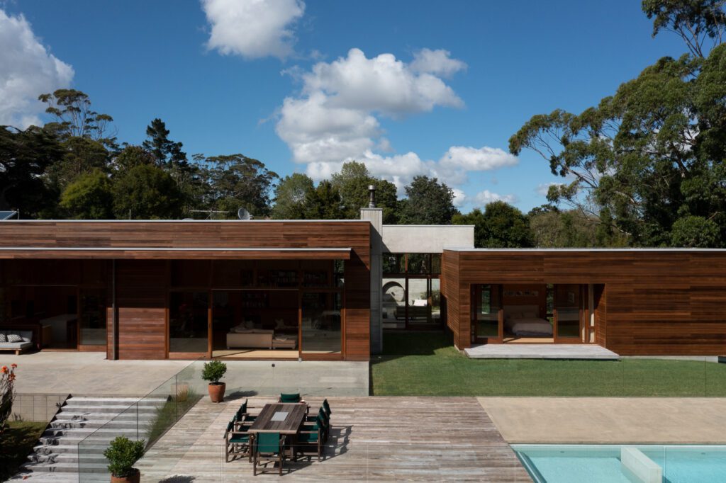 Running along an axial spine, the house is a compilation of rectilinear forms that is grounded at its centre and cantilevered out over the land to east and west. The southern elevation, and entrance, is defined by vast walls of precast concrete, while the northern is clad in cedar and opens out to a series of rural vistas. Here, a lap pool stretches out towards the west, with the poolscaping, like the house, a juxtaposition of materials.