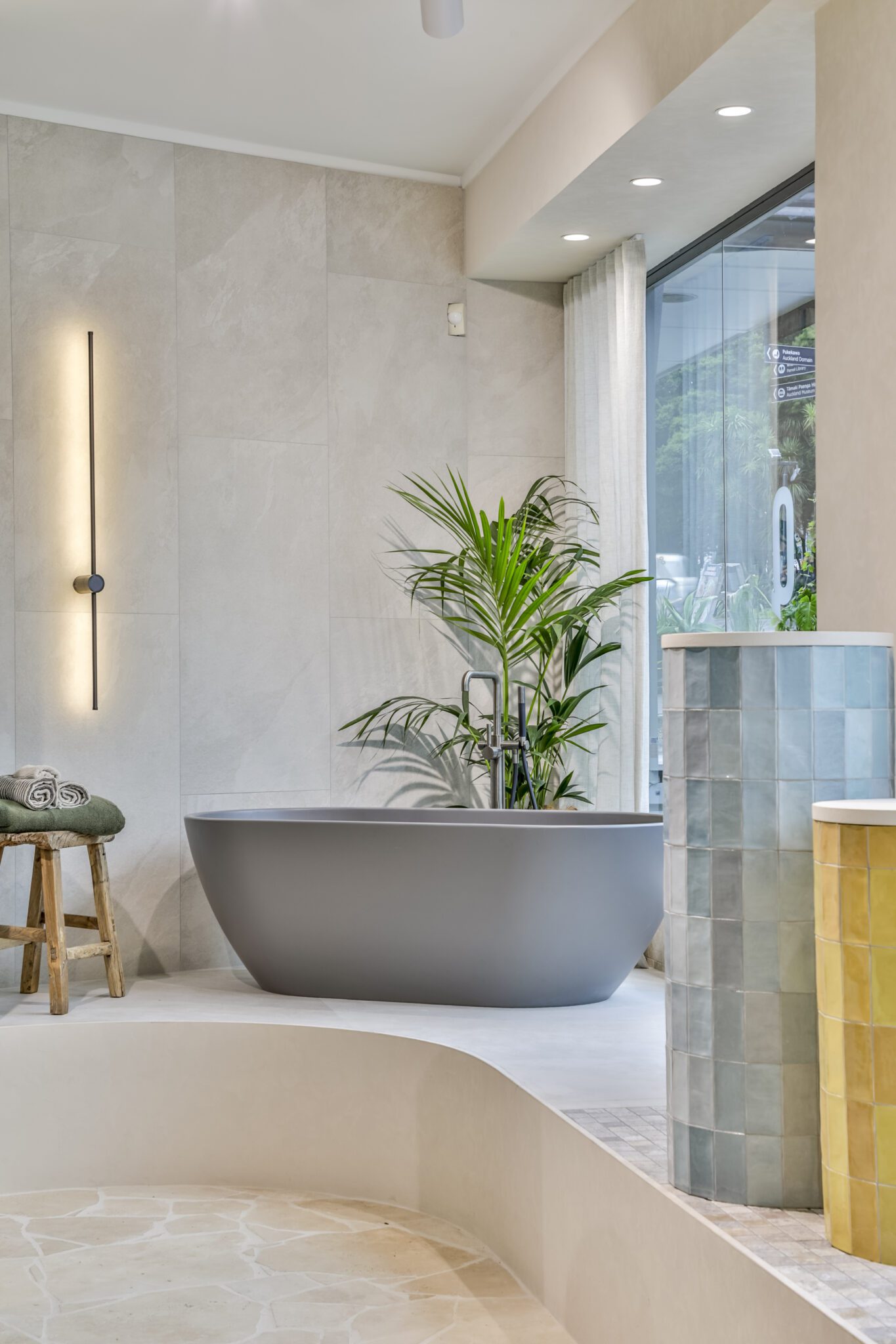 Moving through cork, stone, and tile, the showroom unfolds with a sense of deliberate choreography. Curved tiled walls meet expanses of travertine paving; living gardens thread greenery through the interior; and individual vignettes shift from bold and metallic to pared back, earthen, and refined. Plumbline vanities explore colour and form against tiles while unexpected tiled applications appear in living spaces, challenging conventional boundaries. Throughout, there is an abundance of texture, colour, and sensuous detail — a showroom that sparks ideas and invites both inspiration and touch.