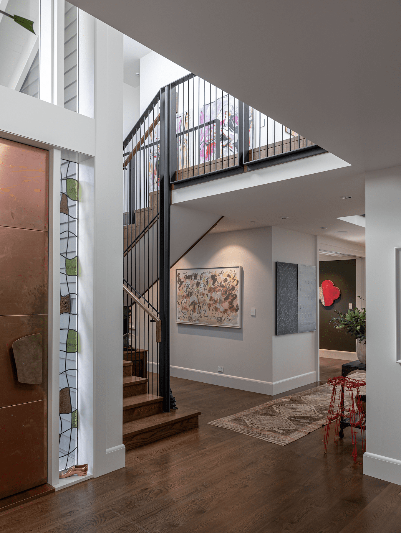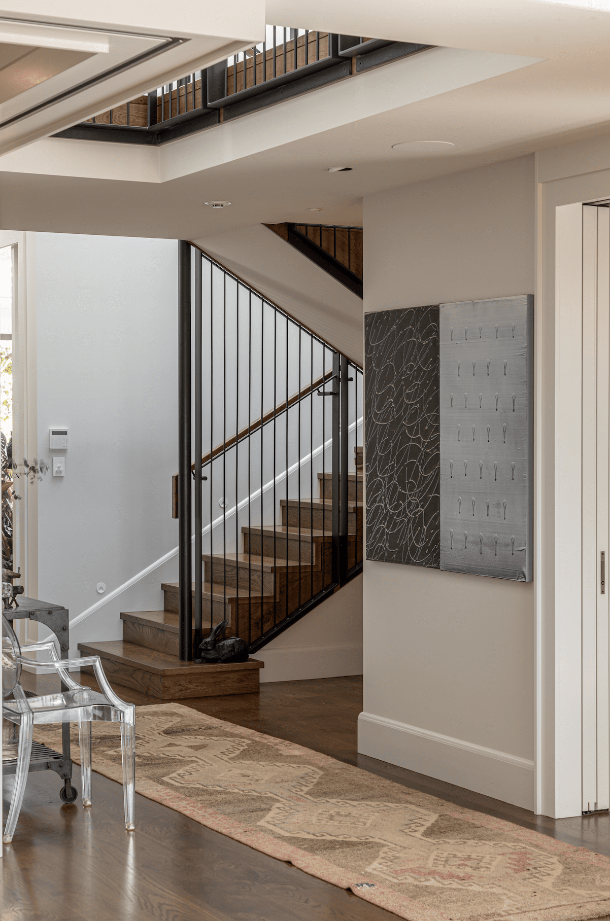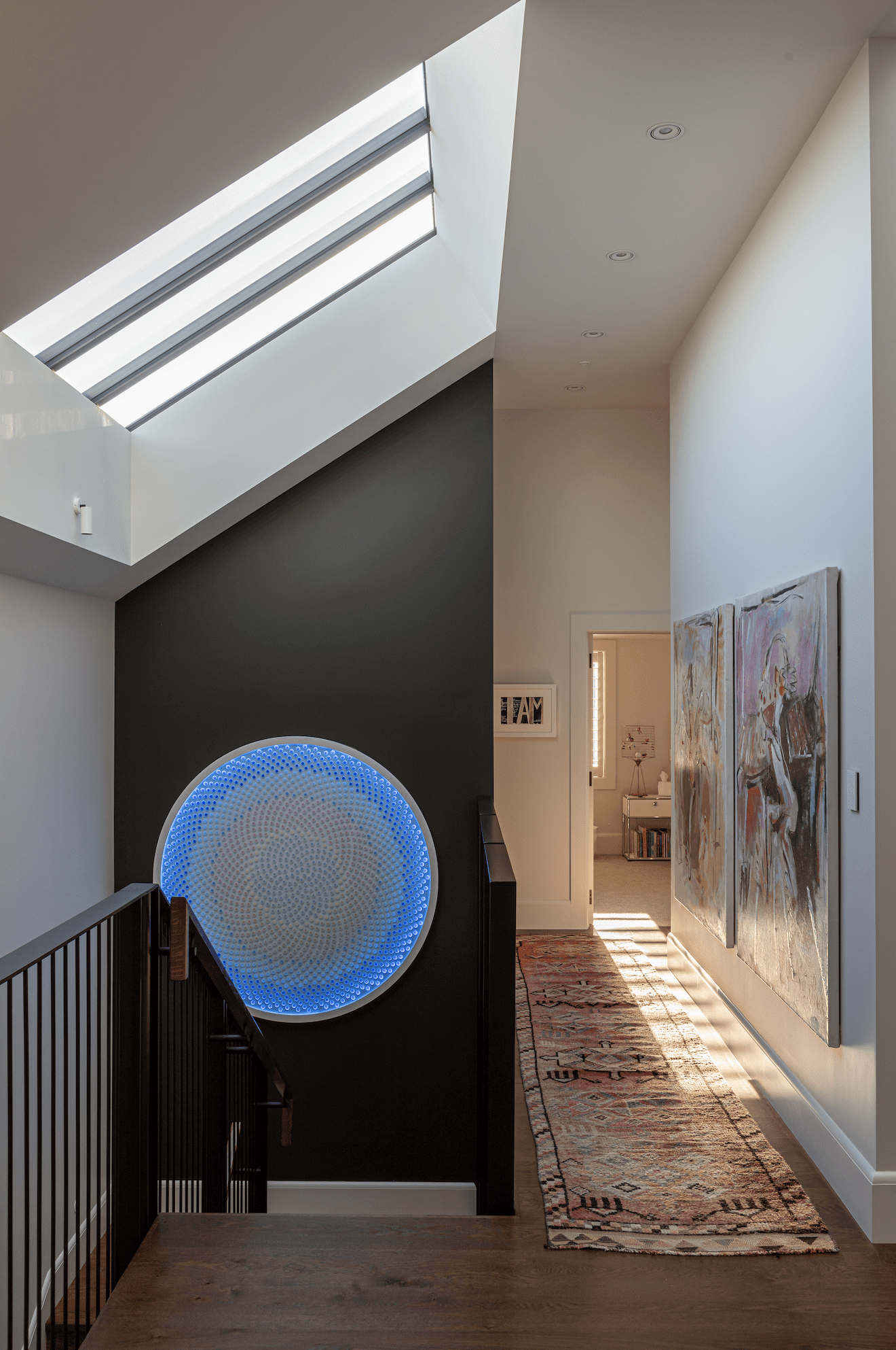 Remodelling the upper level and relocating the stairway unlocked the home’s potential. Previously, upon entering the house, passage into the main living areas was inhibited by the staircase. Now, with it tucked to the side of the entrance, circulation revolves around it.