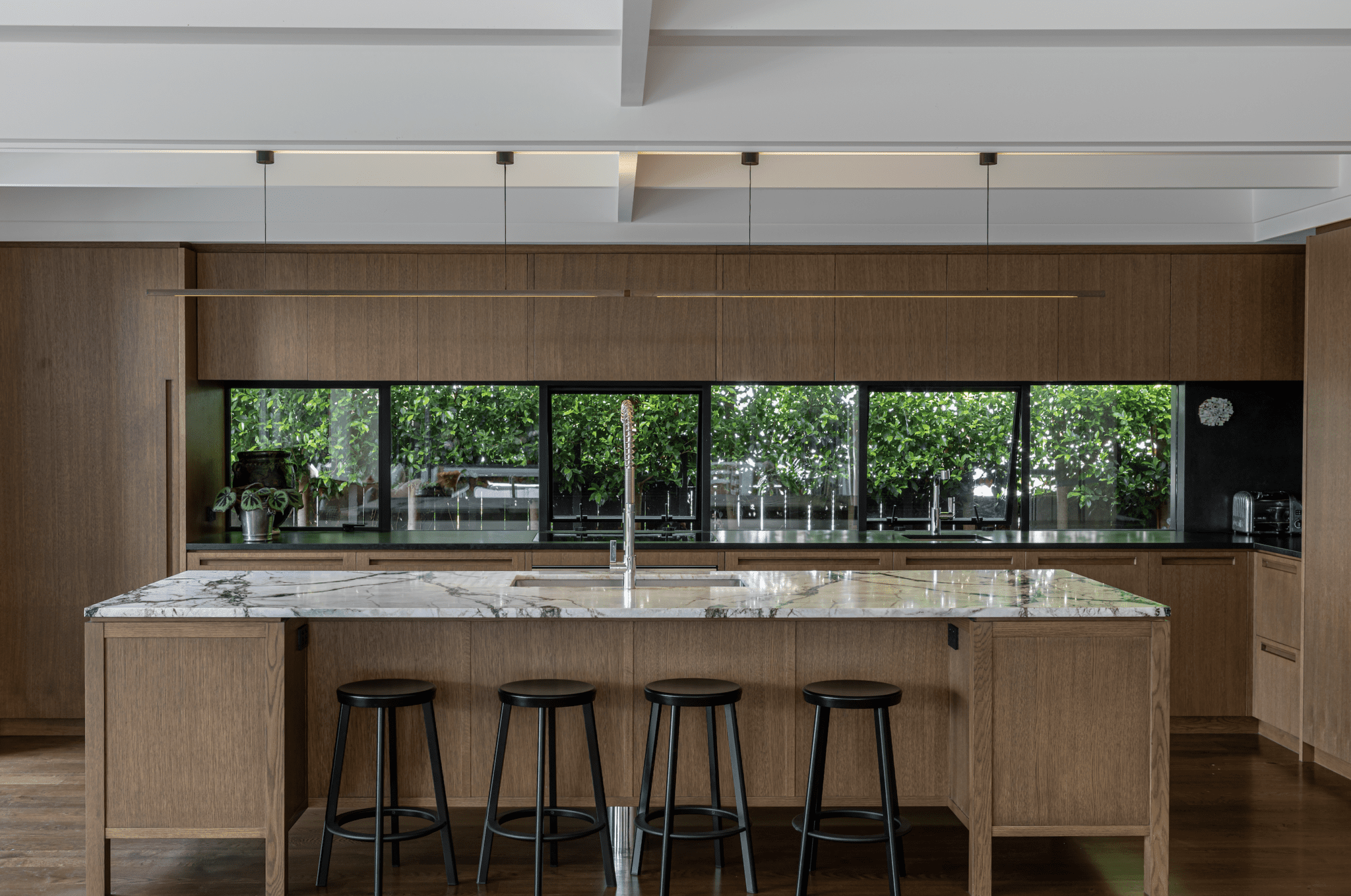 To that end, the existing house was extended a few metres and wrapped by an extensive bay window that exploits sun and views. Lindley says that, as intended, this is where everyone congregates.