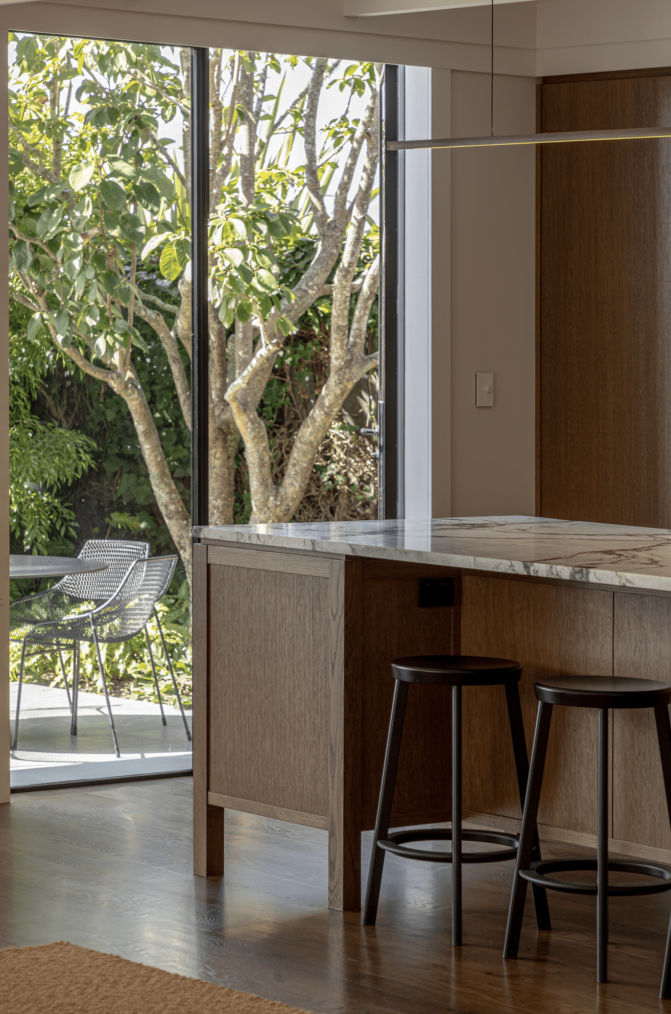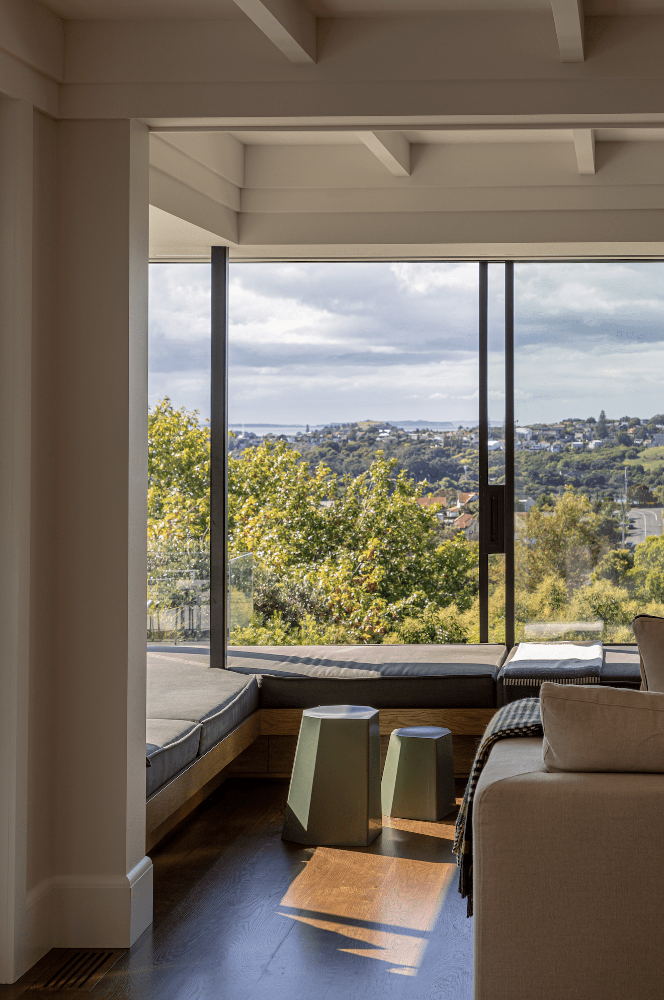 From this light-filled entrance, circulation flows to the generous living areas, where the iconic Tāmaki Makaurau views come into sight. While they are always sensational and on show, Lindley was observant of the ‘views become wallpaper’ effect and wanted to create an enduring space that would be comfortable and welcoming for family and guests.
