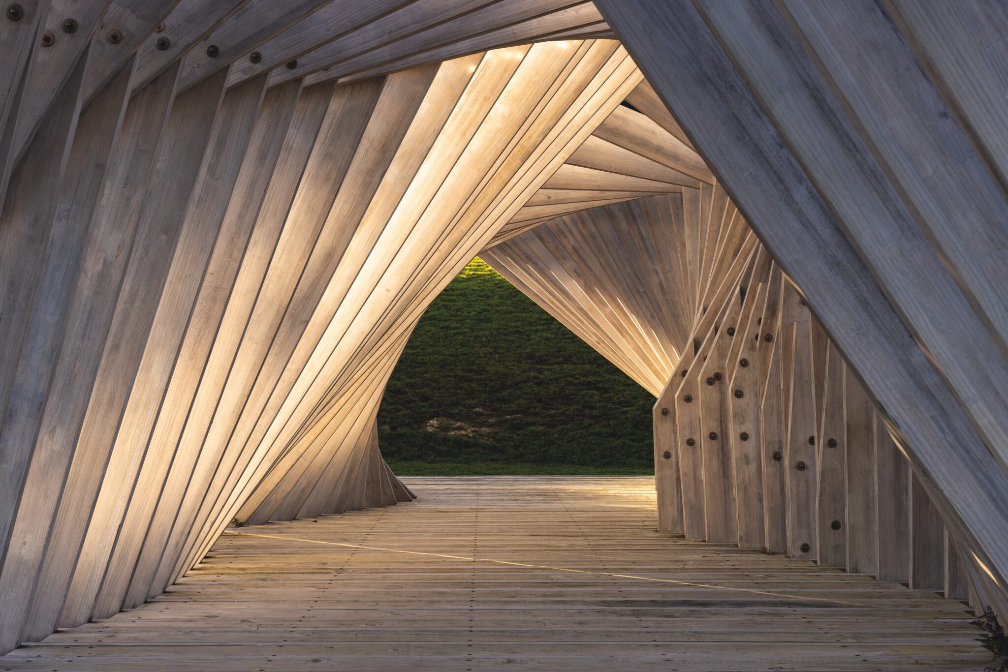 The skeletal structure of the Gateway Pavilion, an architectural folly designed by Stevens Lawson, focuses its many viewers’ gazes steadfastly on the water. The dynamic 16-metre journey through its moving form evokes a whare, a meeting house, a barn, a boat shed — it could be many things; the ideas it presents are vast, morphing as you move through it, but it’s an experience that is distinctly unified: an amalgamation of ideas that form an abstract narrative of Aotearoa’s architectural history.
