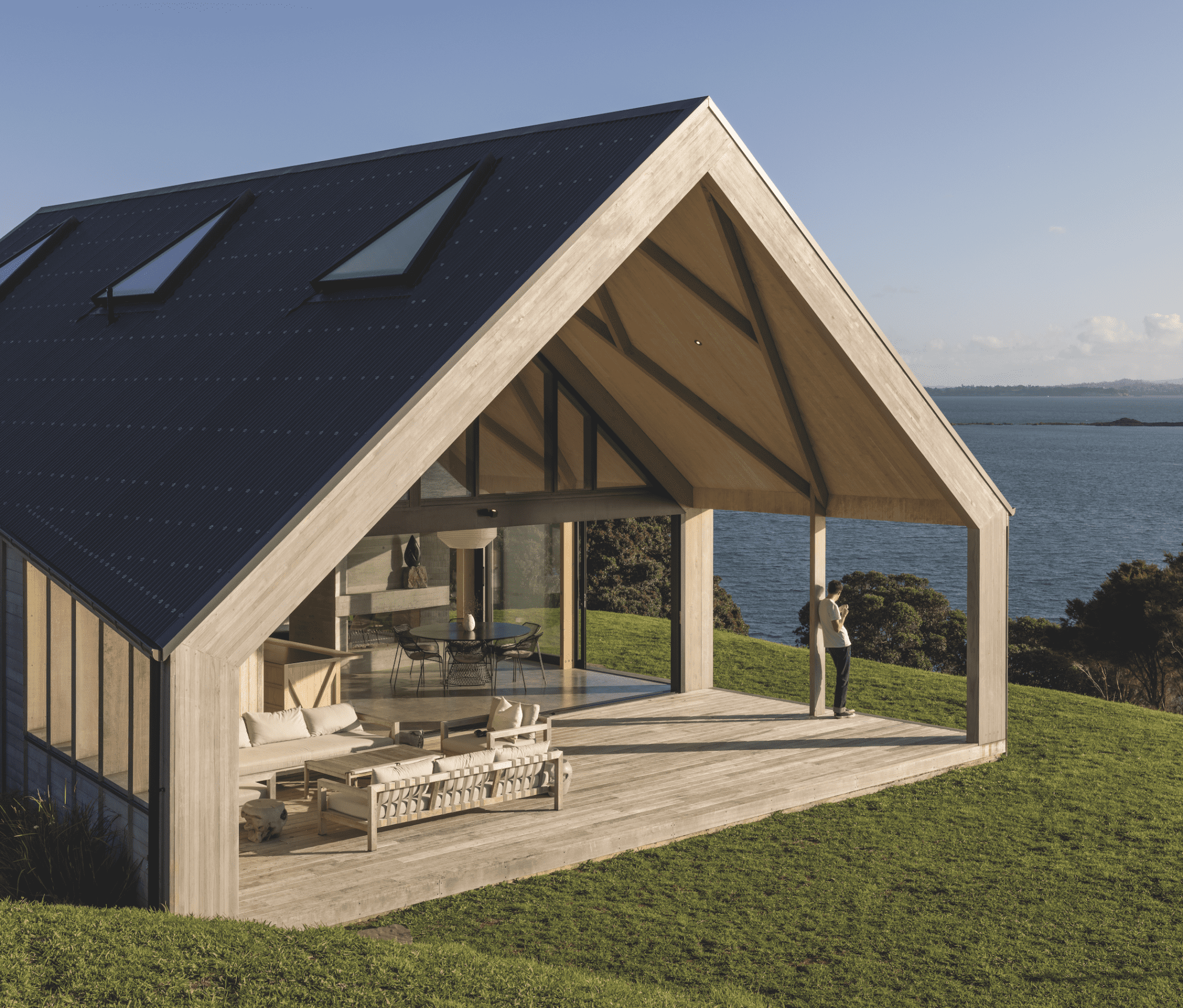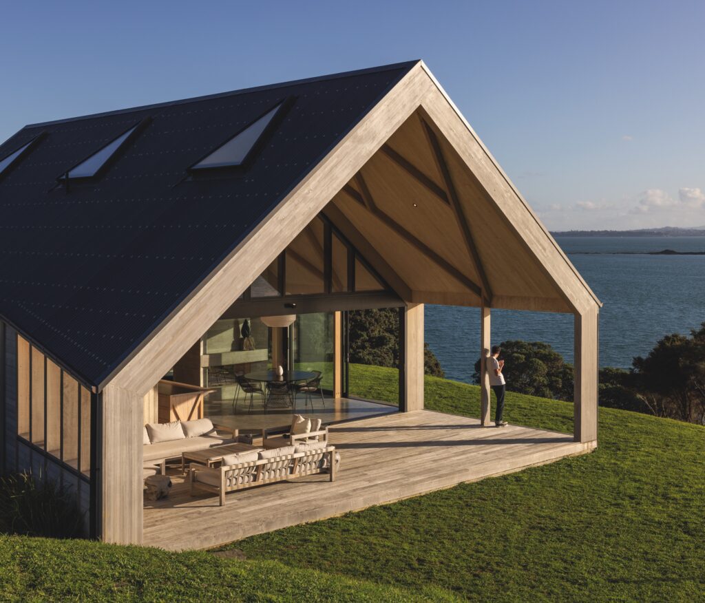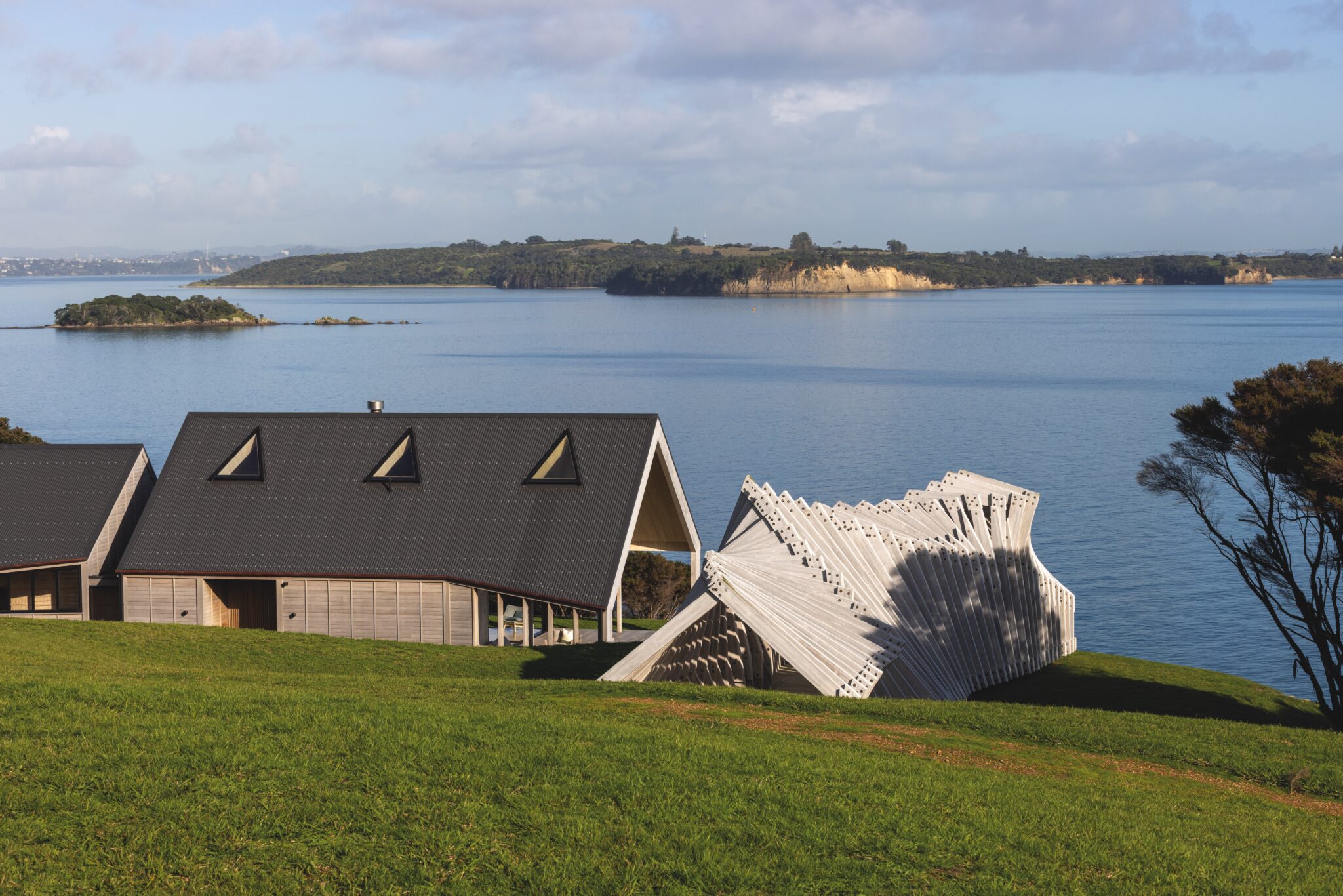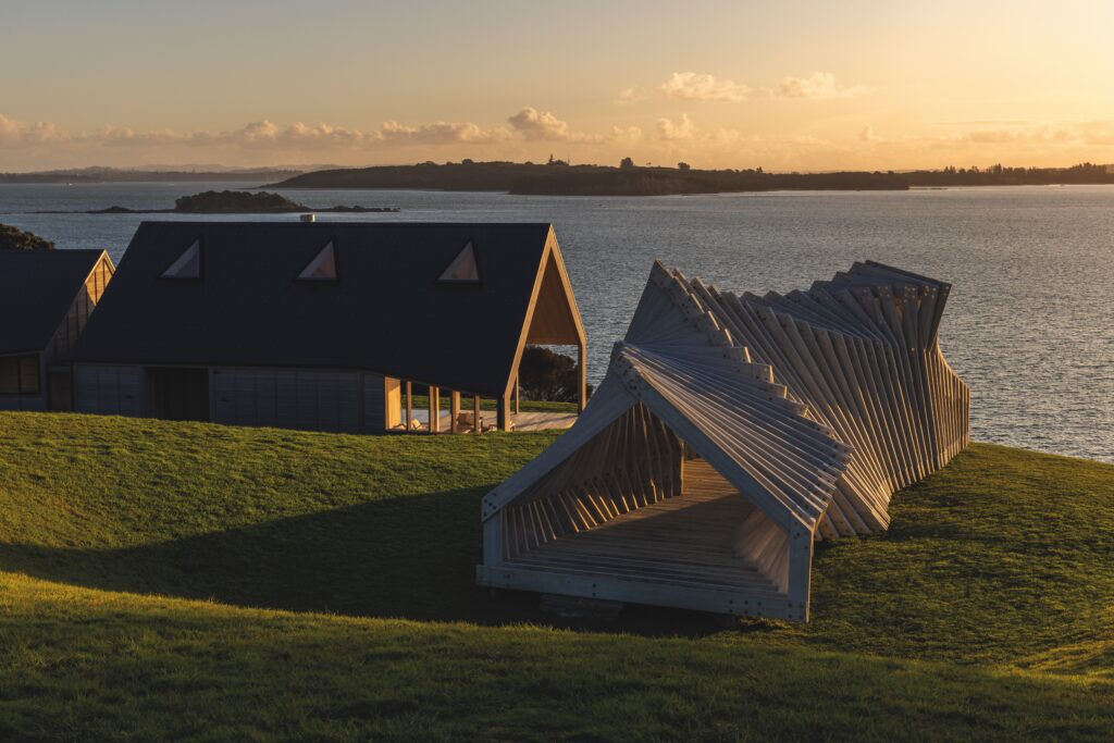 First erected in 2017 and used to welcome visitors to Waiheke’s Sculpture on the Gulf at Matiatia Bay, it was later moved to its current site where it continues to invite wonder, drawing visitors into its folding arms. Perched here, high above the water, it became the starting point for a more ambitious project beside it — a powerful three-pavilion form that turns its face to the sea while its back is drawn into the undulating topography of a site that ultimately drops away to the western shoreline of Waiheke Island.
