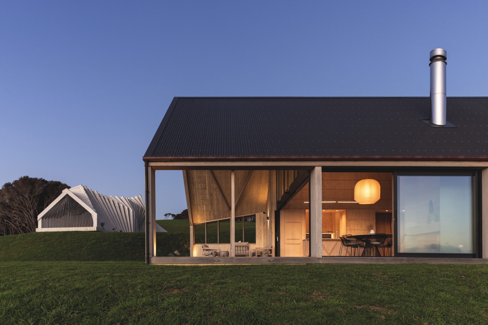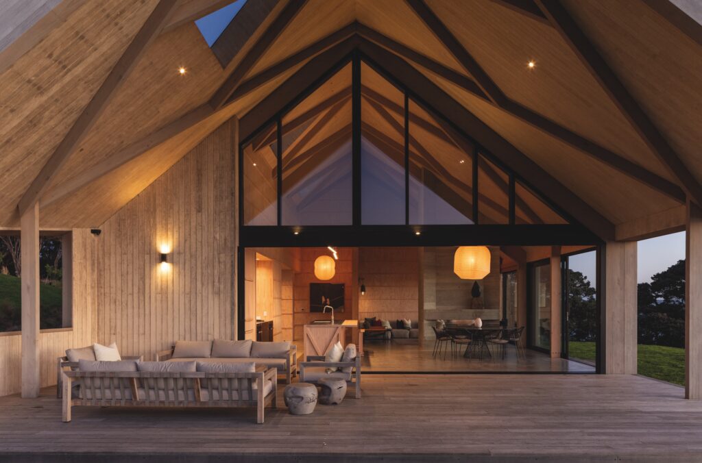 Pivoting around natural curves in the land, it too references whare, and the quintessential New Zealand barn. By separating the pavilions — two for sleeping, one for living — private, sheltered courtyards, micro gardens, are formed in the voids between.