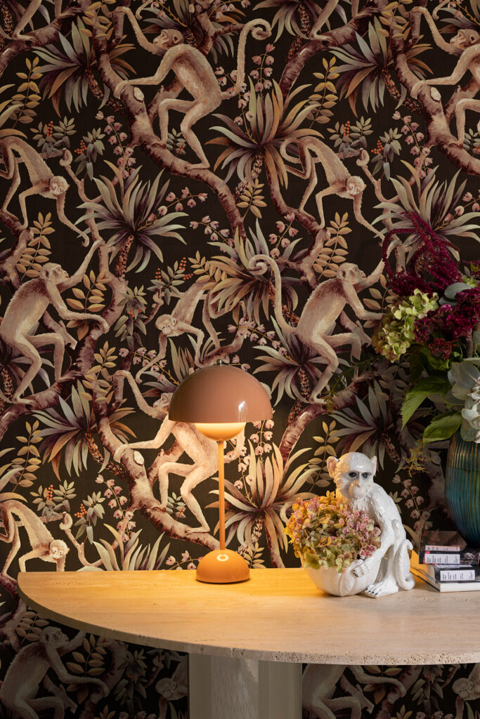 Elvis’s love of peacocks (and his infamous peacock-embroidered jumpsuit) informed the Royal Peacock design (pictured), while his porcelain animal statues became the basis of the Monkey Business wallpaper (pictured).