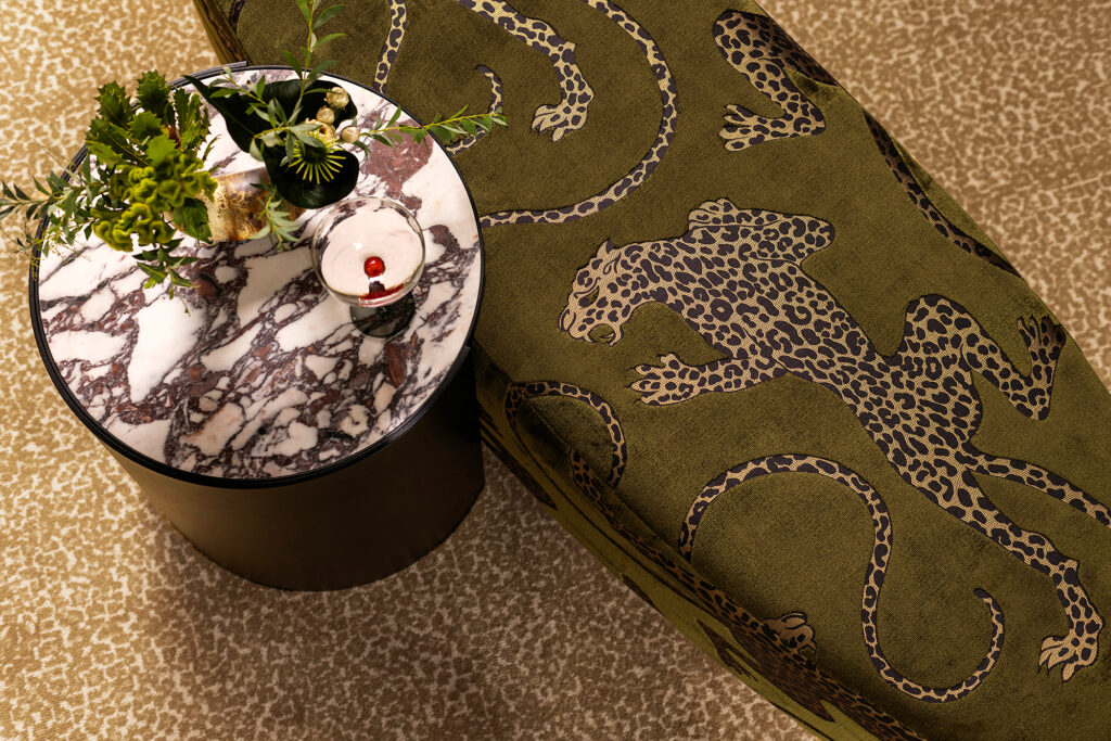 The singer’s iconic and eccentric attire, particularly his embellished jumpsuits and capes and bejewelled belts, at once beautifully intricate and shamelessly bold, were the inspiration behind the Panthera print (pictured), which is woven in a cut-pile velvet construction with the leopard motif sunken into the cloth.