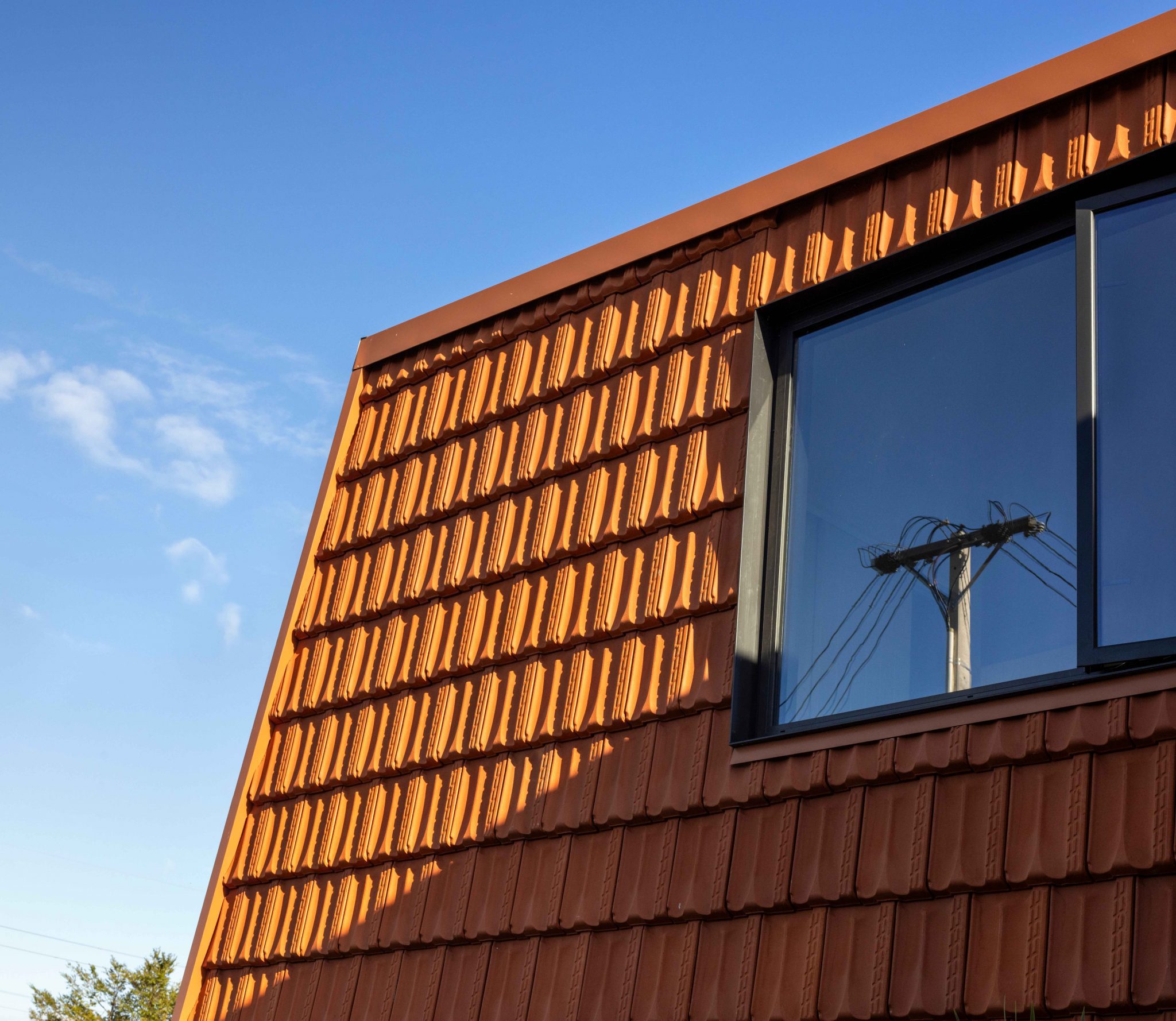 As you meander down the driveway, the vibrancy of the cladding slowly comes into focus. Both buildings are wrapped entirely in Monier roofing tiles, which create a playful rhythm of light and shadow from every angle.