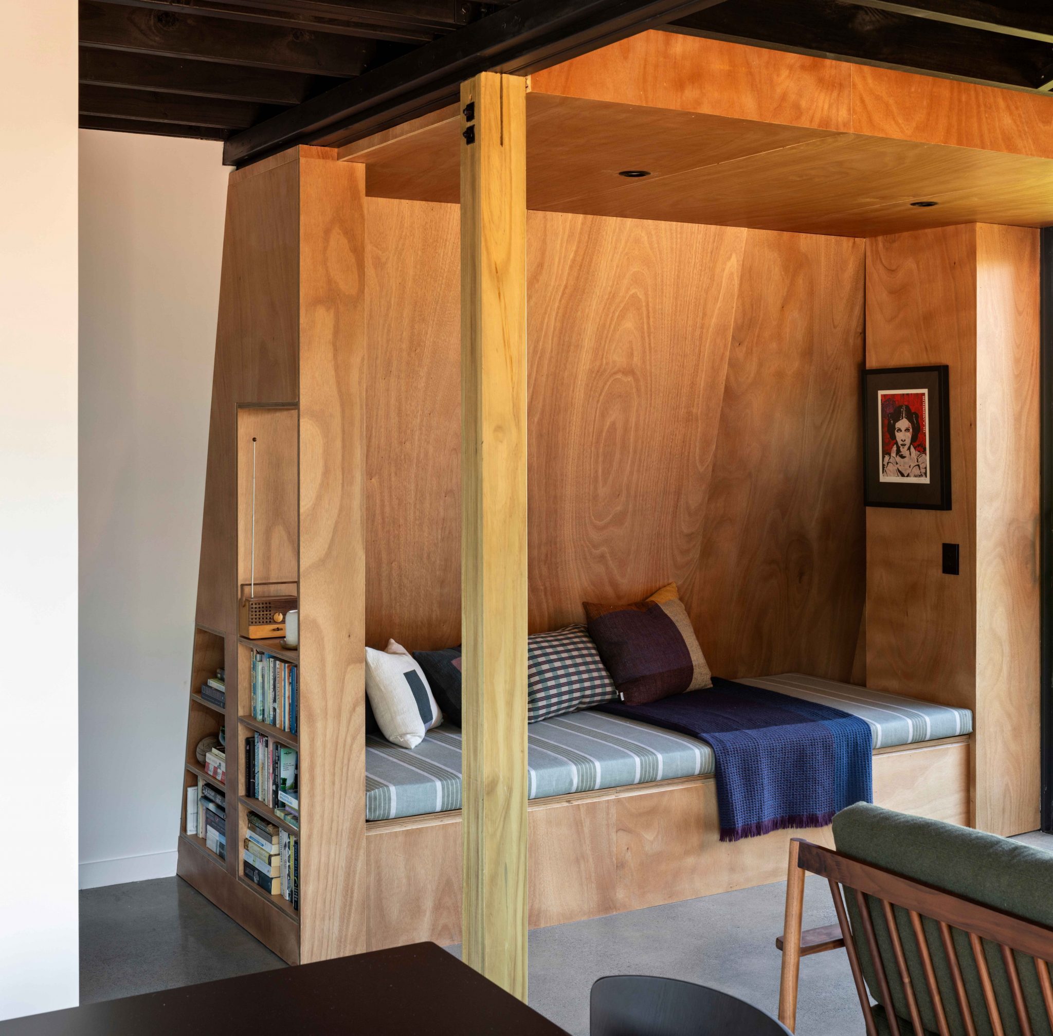 The melamine kitchens are simple but highly functional, and a tad playful: one is painted in a sage green, the other in a vibrant orange. Tiled splashbacks and stainless steel benchtops are designed for low-maintenance living. Polished concrete floors maximise solar gain, ply lines the downstairs walls, and built-in shelving reduces the need for additional storage. “There’s also a built-in divan bed that doubles as a guest bed, and a laundry cupboard at ground level.