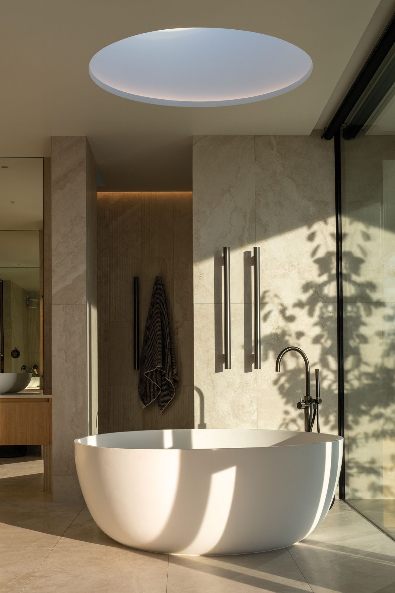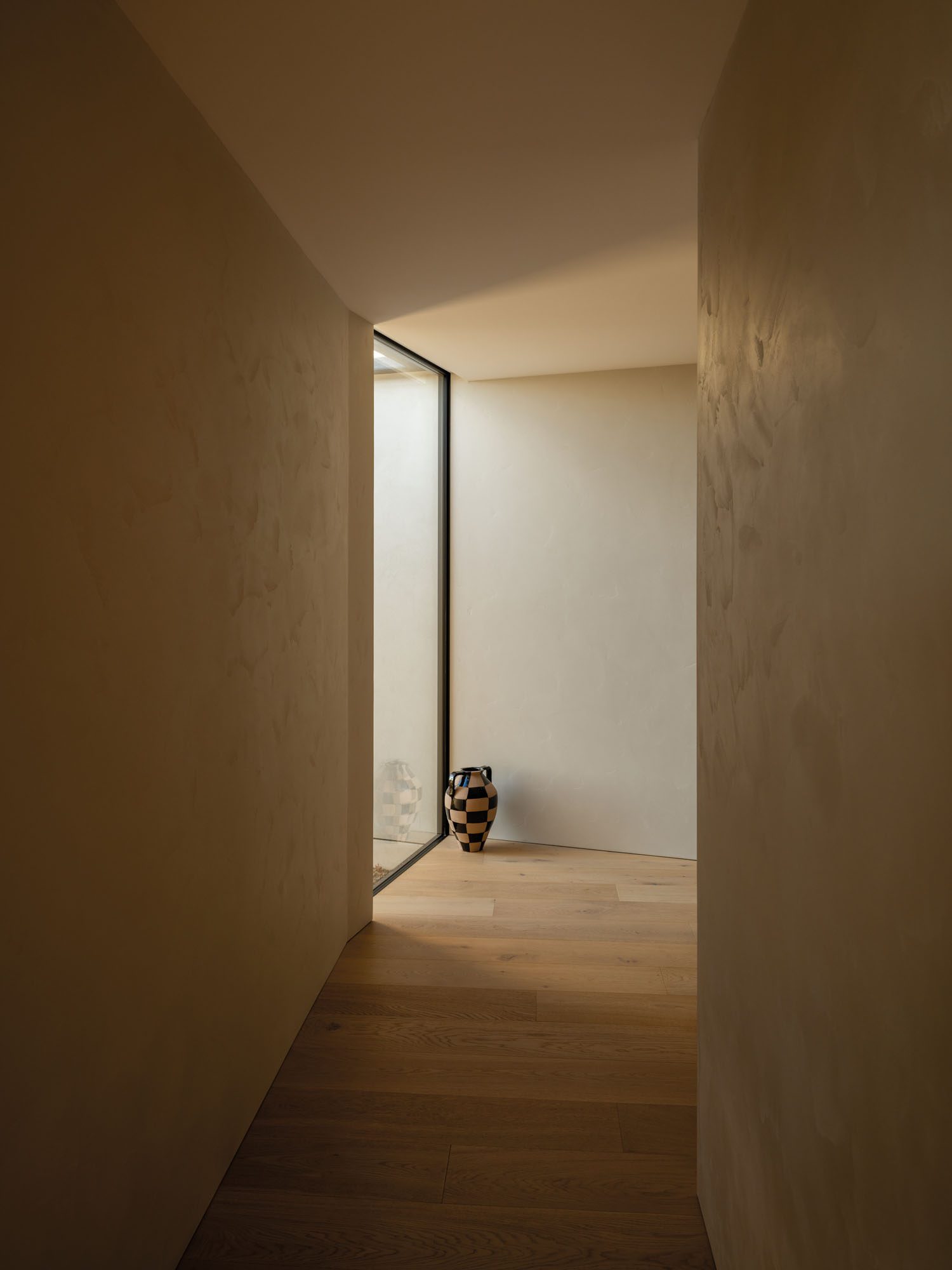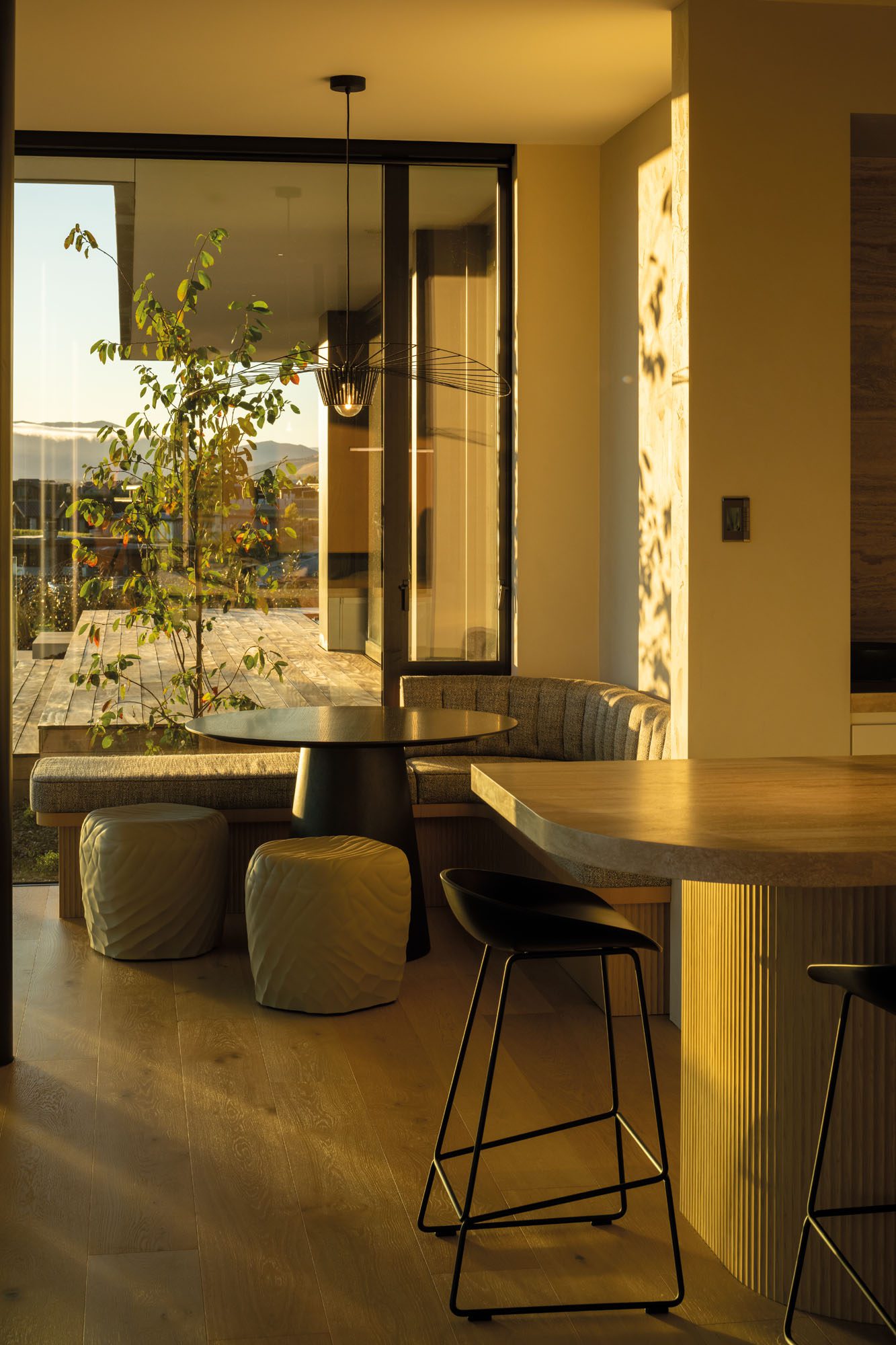 Throughout, it is the dialogue between light and material that speaks to the soul of this home. Textured plaster walls catch the light; skylights bounce it, articulating soft, organic shadows. The result is timeless, modern — a home equally responsive to its occupants and to the land it inhabits.