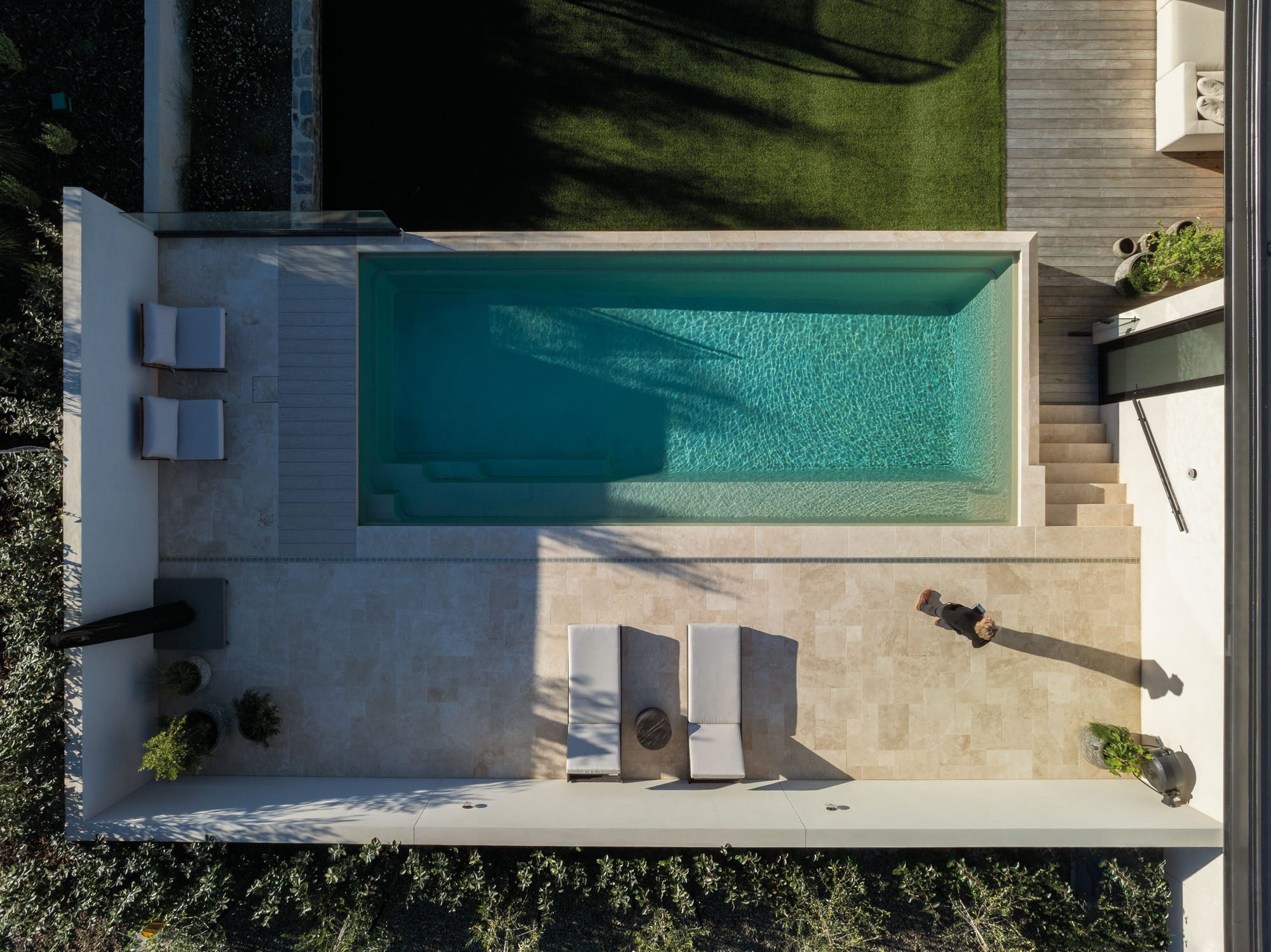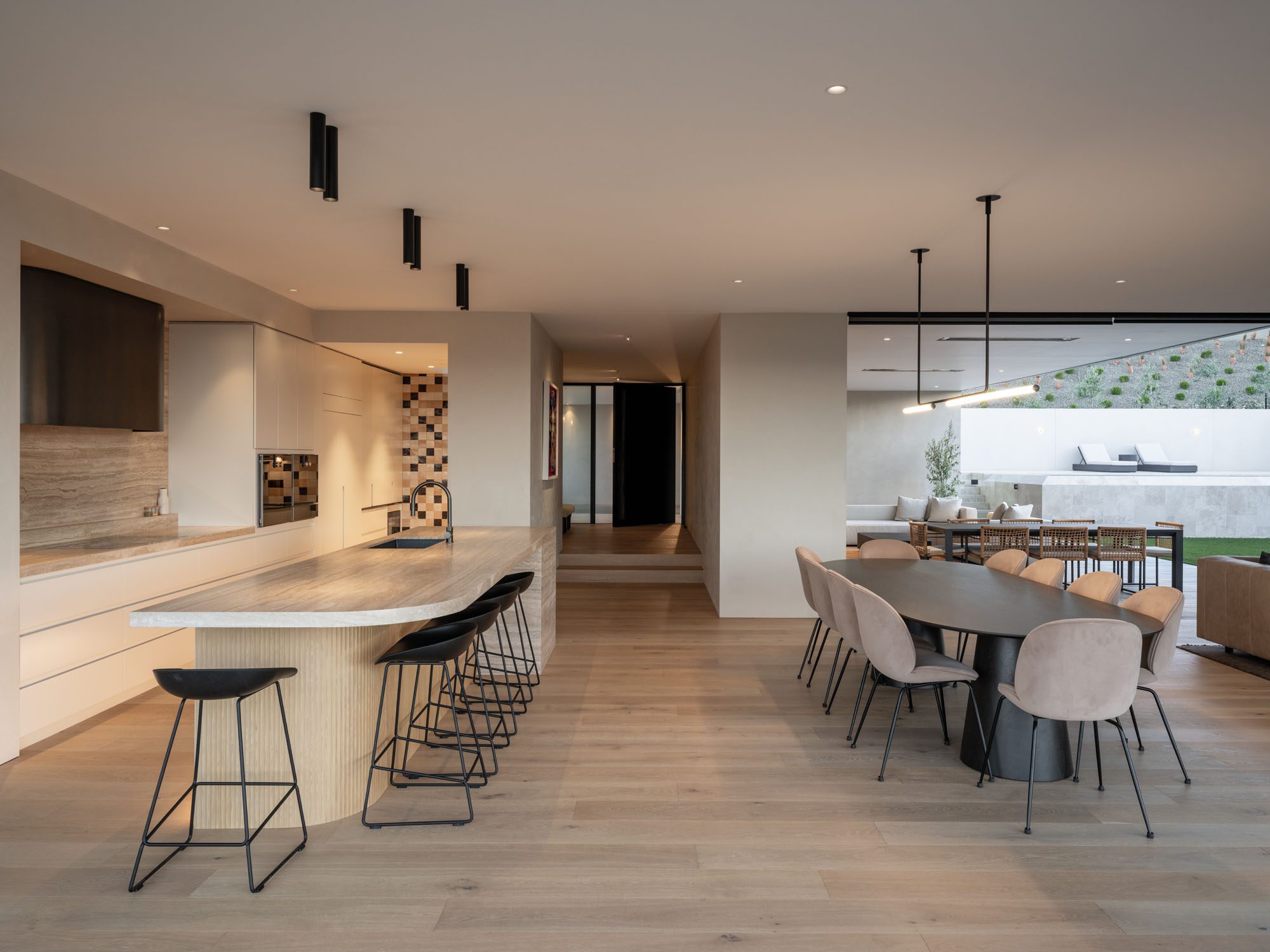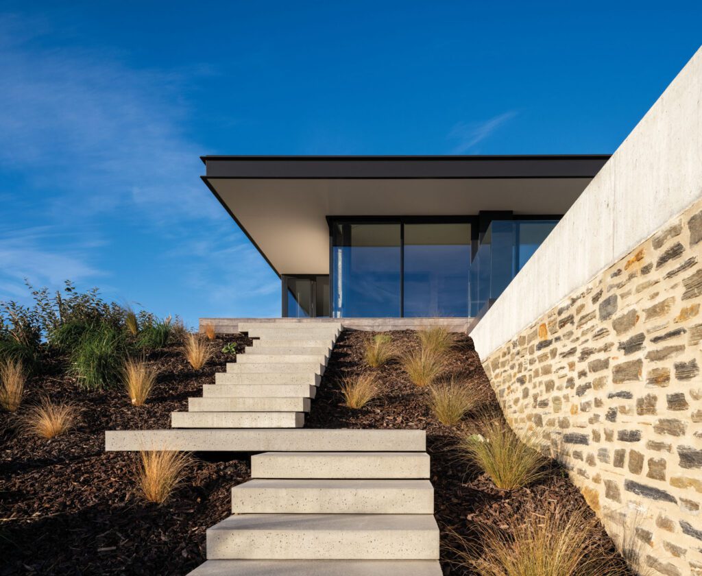 “The bunker is embedded in the sloping site, with a green roof that folds it into the land,” Regan says. “A curvilinear retaining wall, lower seating area and meandering boardwalk contrast [with] the home’s rectilinear geometry, introducing a sculptural softness to the overall composition.”