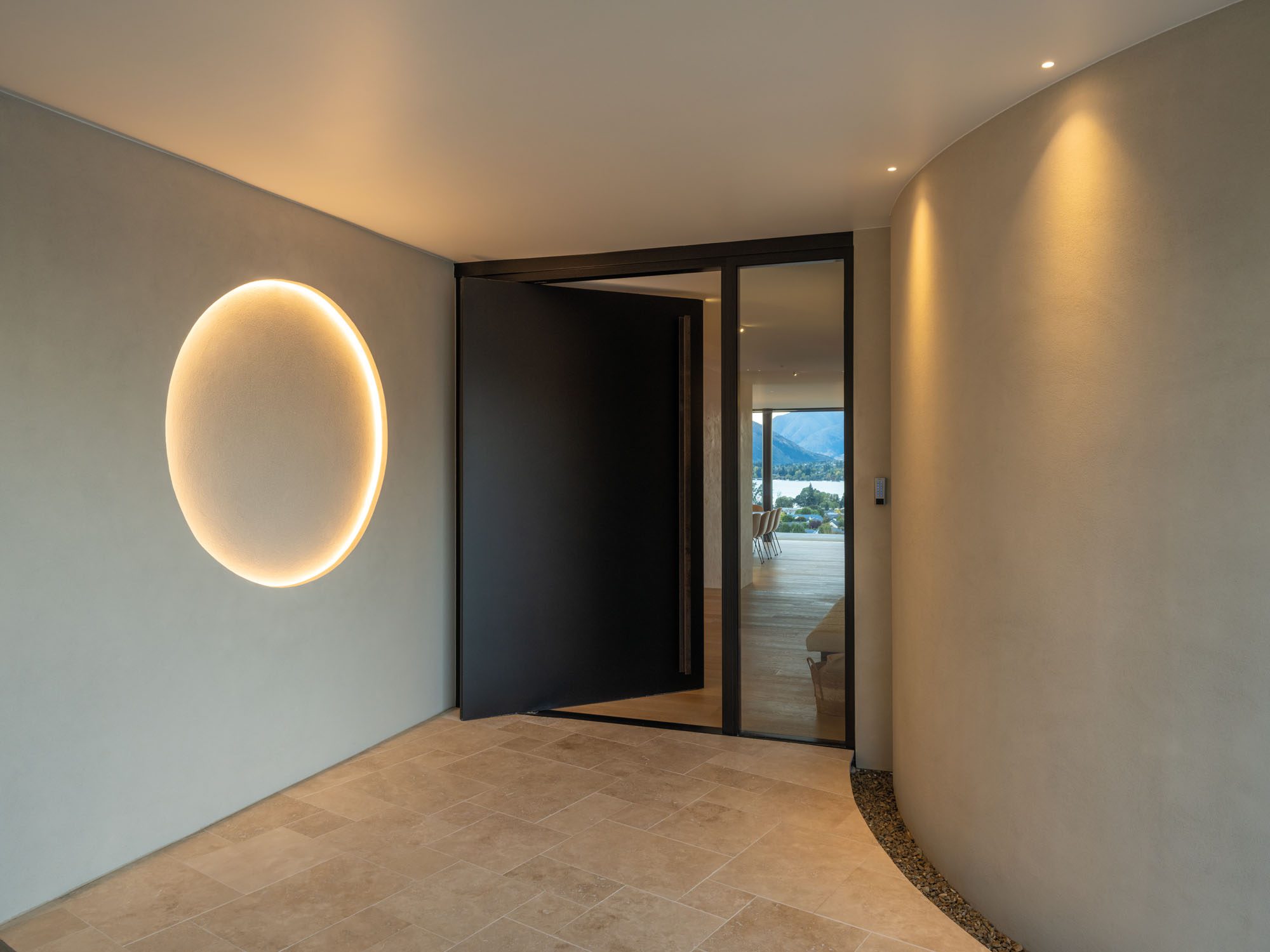 In the main dwelling, the central spine unfolds into the kitchen, dining and living areas, each opening to overlook the lake. Expansive glazing renders the dramatic alpine landscape ever present; light floods deep into the interior. Deep eaves and overhangs provide shade in summer and shelter in winter, perfectly calibrated to the region’s climatic extremes.