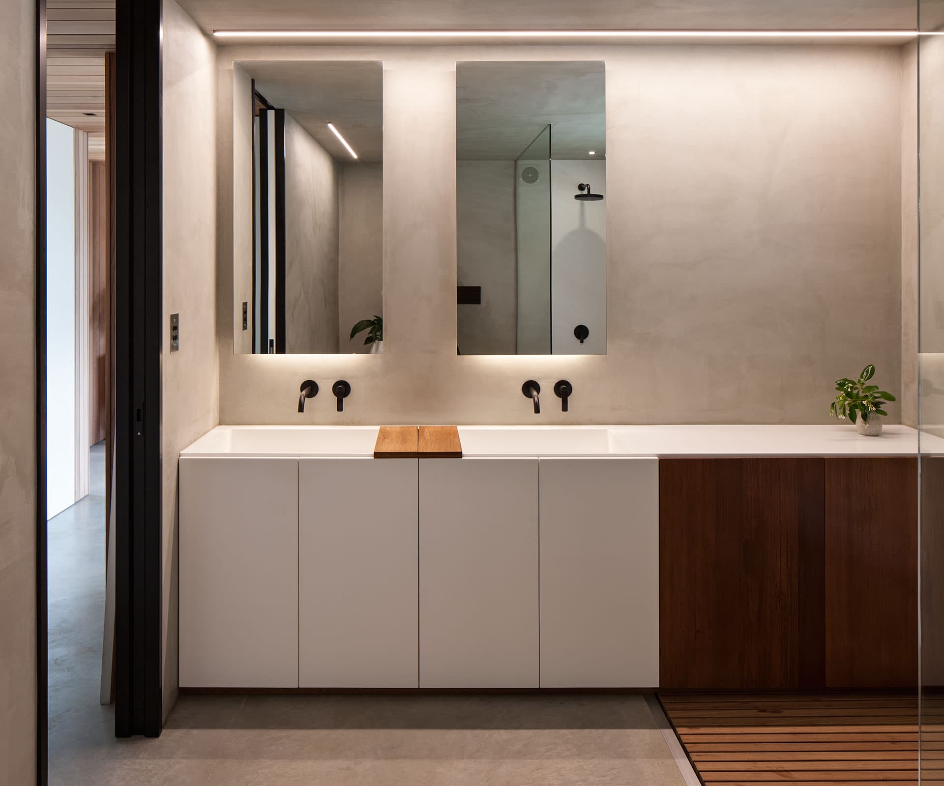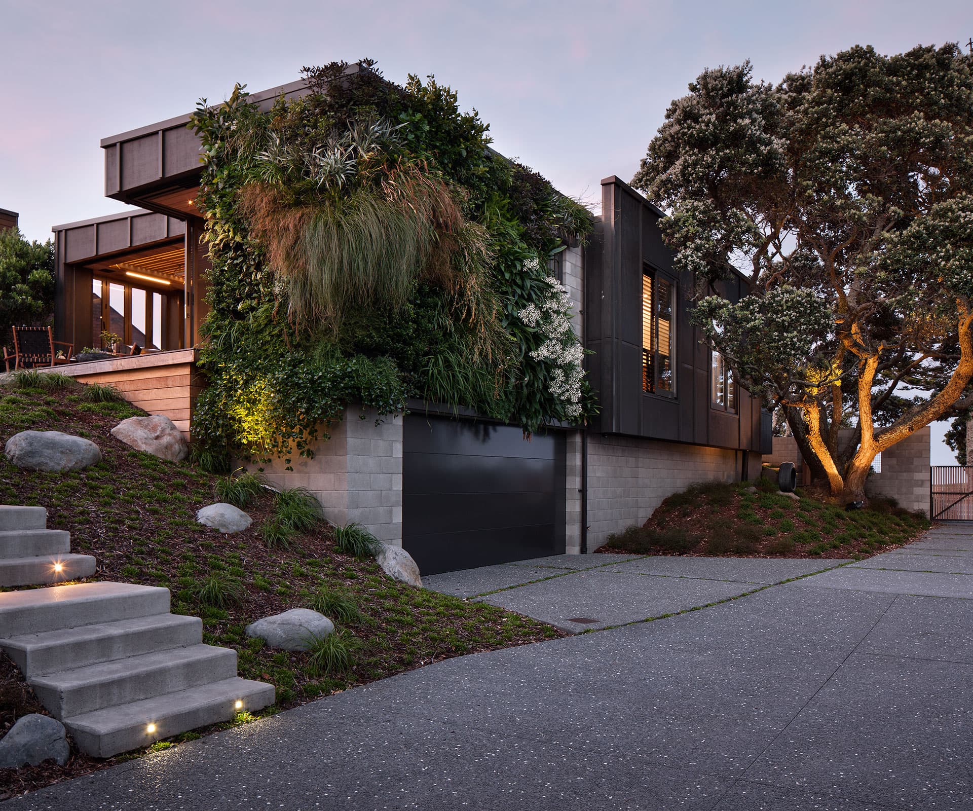 Key to this was managing the scale of the front house, and opening new view shafts, retaining the existing pohutukawa tree, using a greenwall to reinstate the green outlook of the rear house, and developing a shared central courtyard between the two.