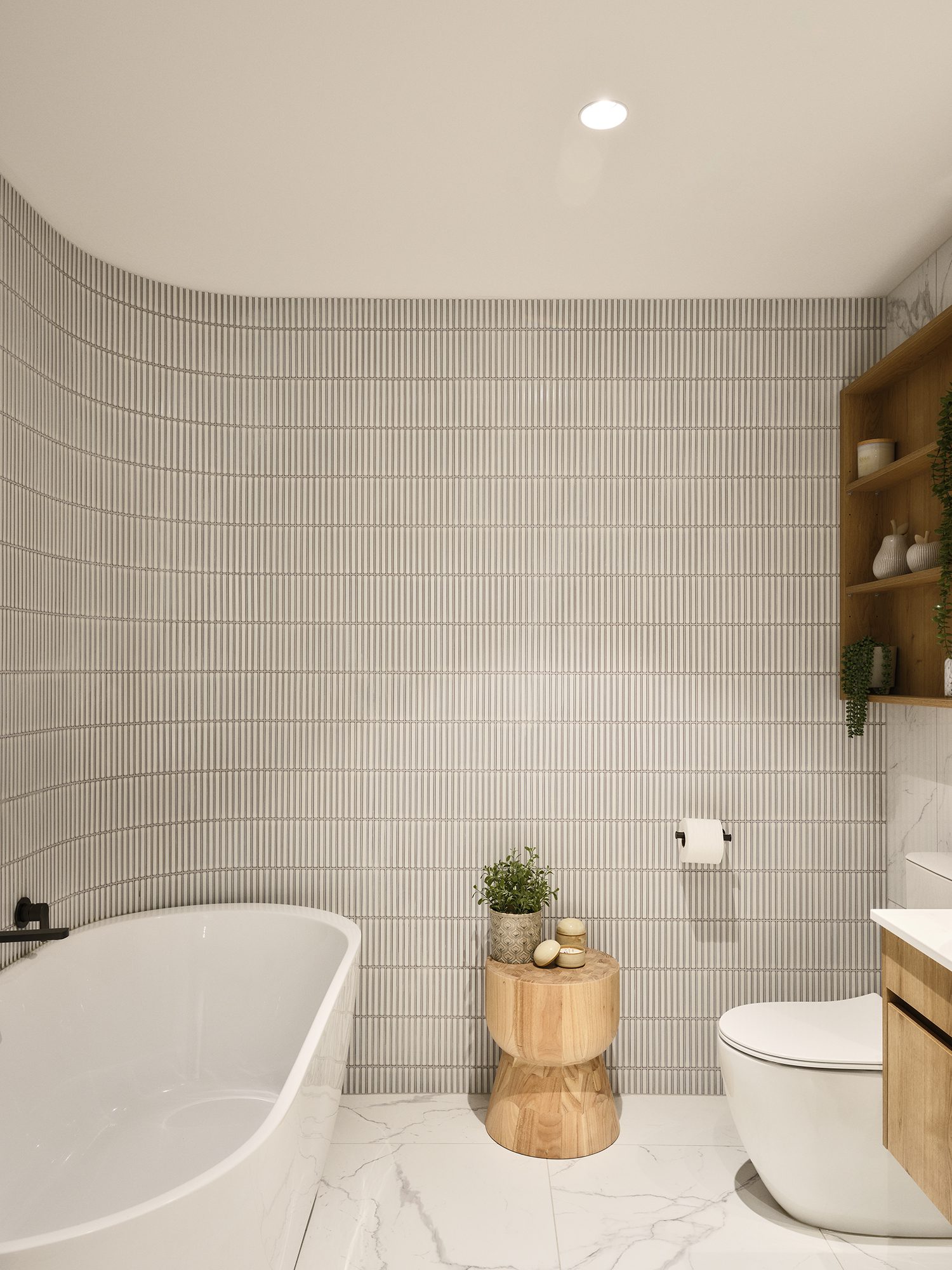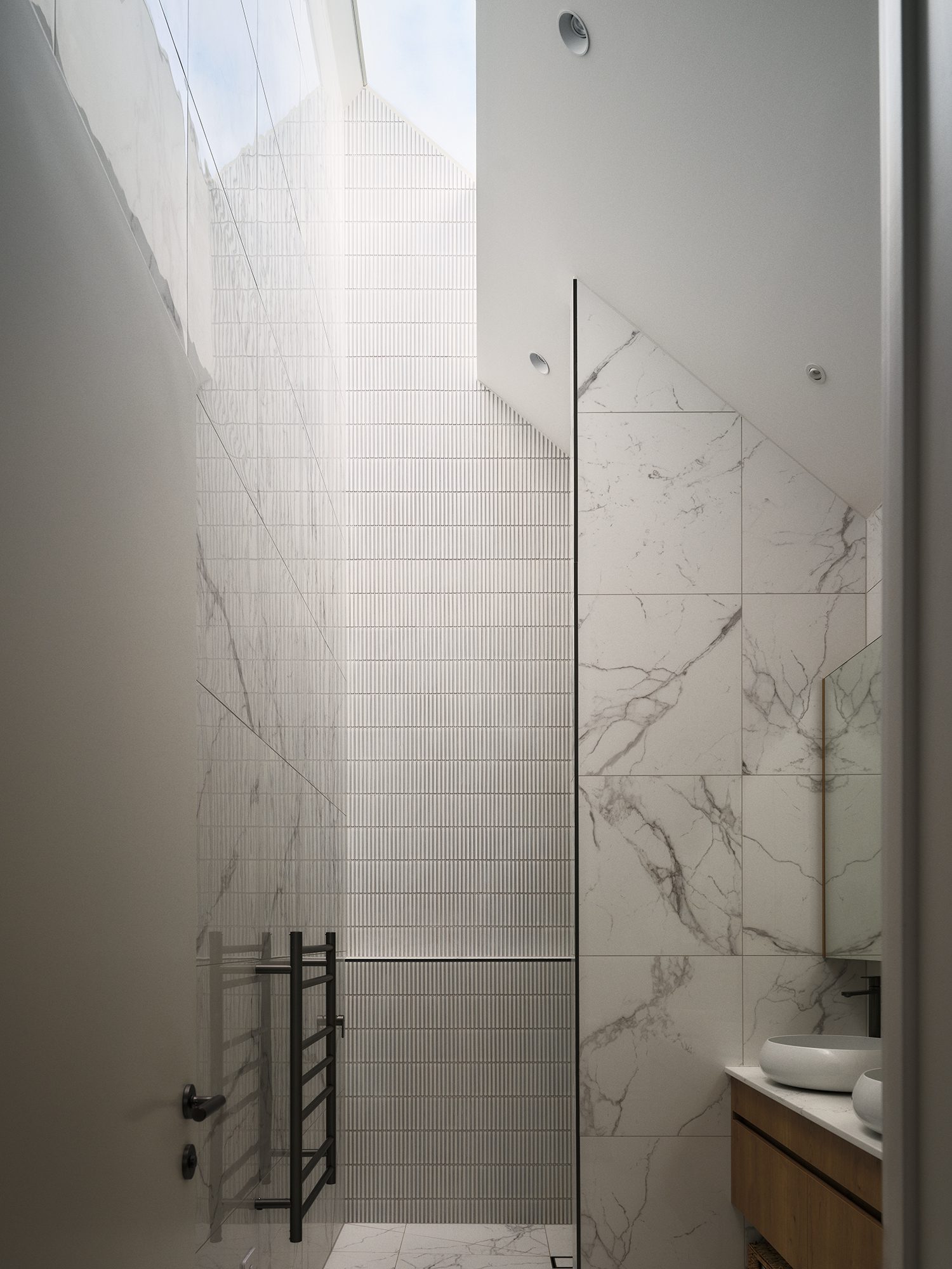 “Jalcon Homes wanted these homes to be architectural, so one of the big expressions of that is the interior spaces, which are lofty and generous — unusual in a developer-led market,” Gary says. “We love introducing light in surprising ways: skylights in stairwells and in bathrooms, and interesting windows. Here, that play of light has the effect of adding another dimension to the experience, and making the interior spaces feel quite special — with a real point of difference to a lot of terraced product.”