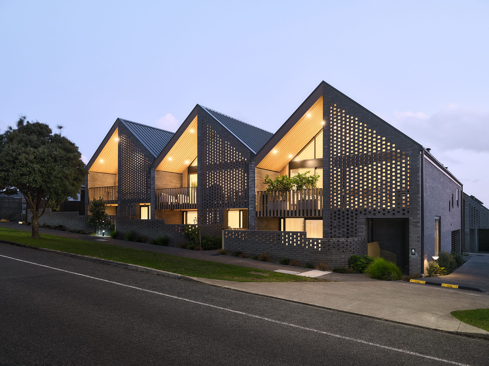 “The simple pitched roof forms are a favourite of ours. They are an iconic house form but, set in a group of three, they feel quite strong and self-assured. Teasing apart the brick to create screening, they make for quite a dynamic street frontage.”