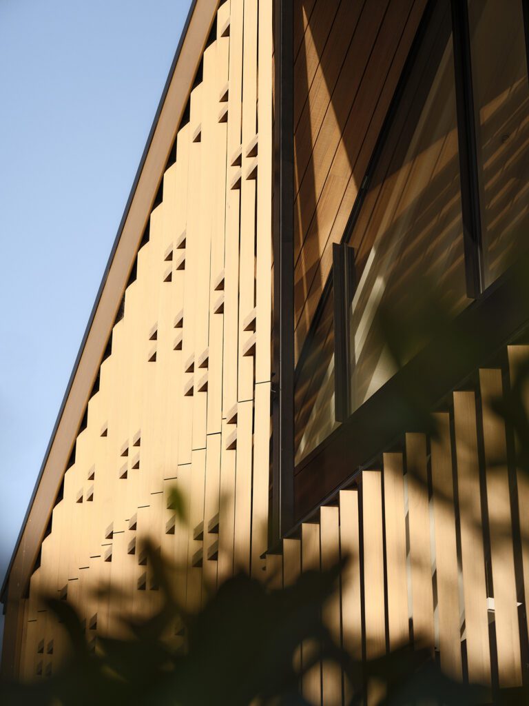 Those perforated brick screens, covering half of each boatshed-like form, carefully mediate two situations — offering connection with the community, or the ability to retreat from it when desired. Behind them, floor-to-ceiling glazing extends the living spaces outwards, where deep balconies are sheltered beneath the eaves.