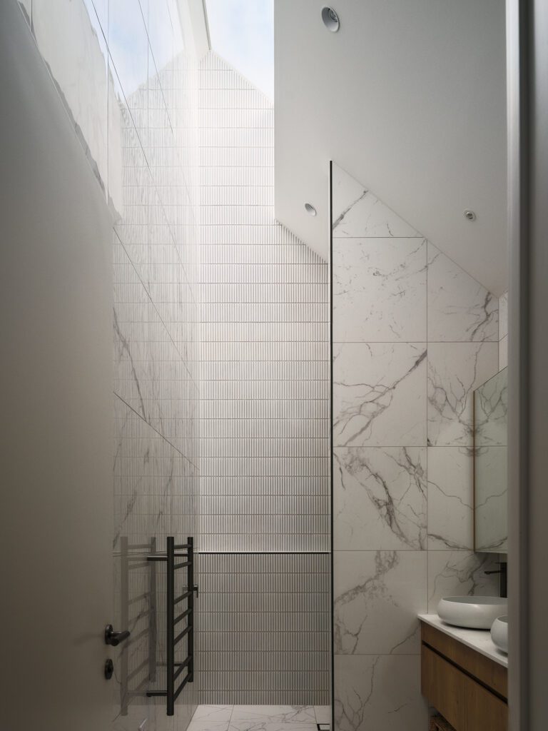 The use of skylights in bathrooms and above stairwells ensures a sense of generosity in these interiors, and draws light deep into the centre of each home.