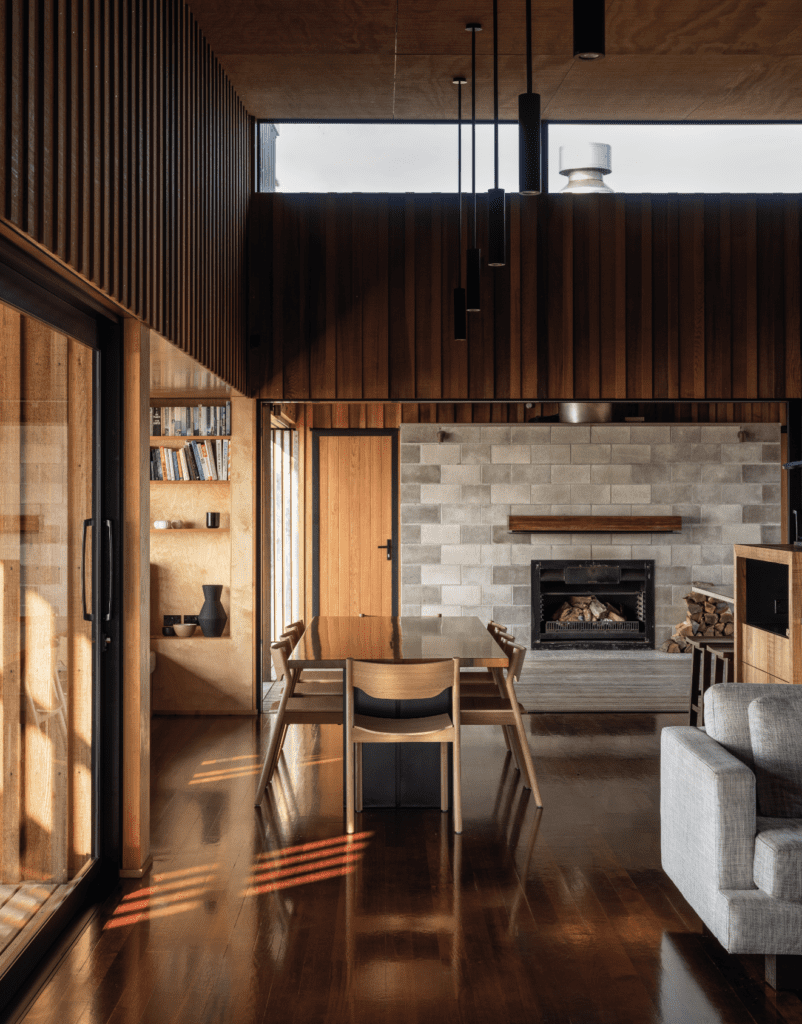 Inside, the beauty of the timber is consistent with the deep brown hues of the native bush that covers much of the island, creating a series of spaces within which to shelter and connect; outside, it takes on the sandy tones of the coast, allowing the building to slowly recede further into the landscape from which it emerged.