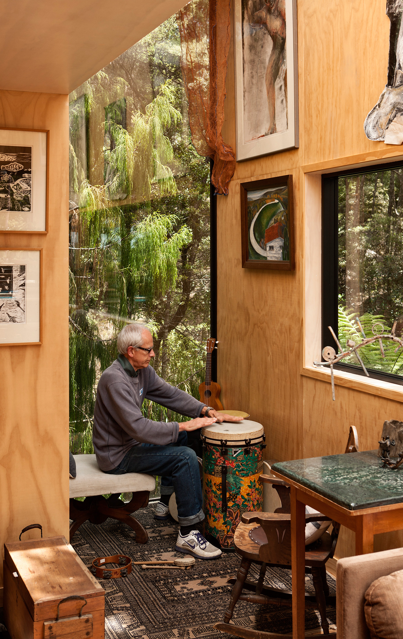 The southern elevation, where the stairwell projects, has a glazed roof that follows the angle of the stair but continues way above the roof line. It’s a jaunty glass enclosure, an aesthetic curiosity that is vented to act as a heating-cooling chimney. The roof deck, under all-day sun, overlooks the leafy canopy – an eyrie for humans. In summer the grandchildren pitch a tent on its wooden surface: fledglings in the nest. To anchor it, they tie the guy ropes to “great big water bottles” Janis explains.
