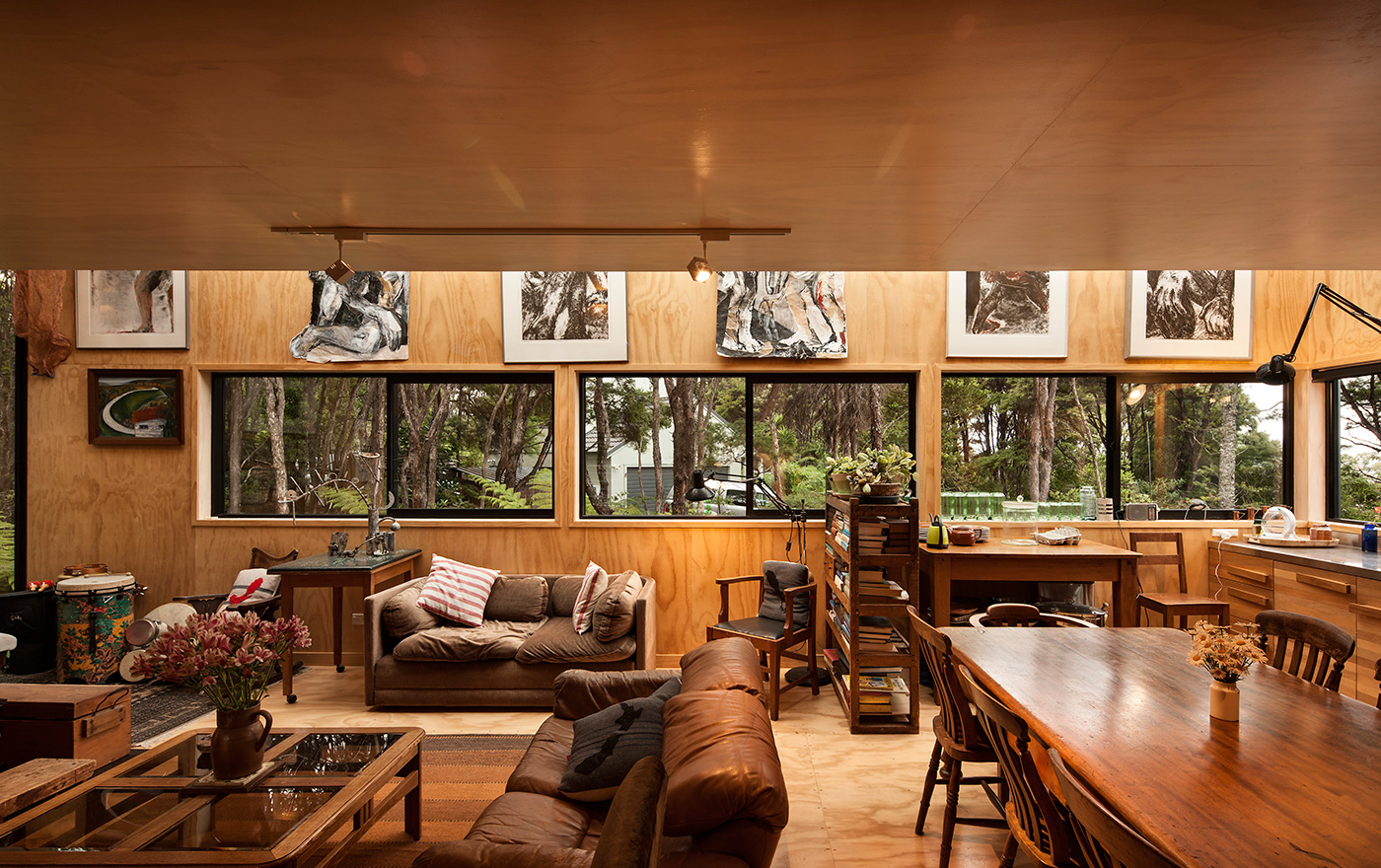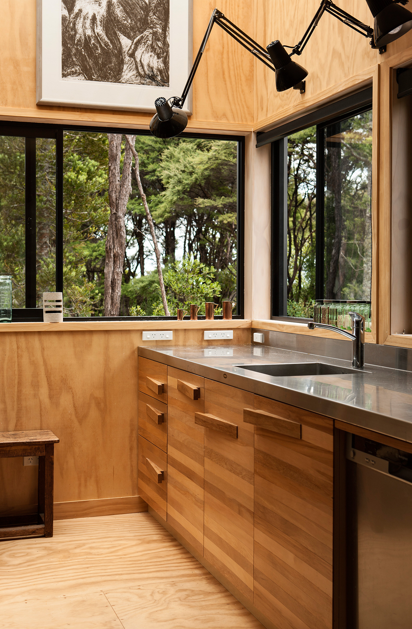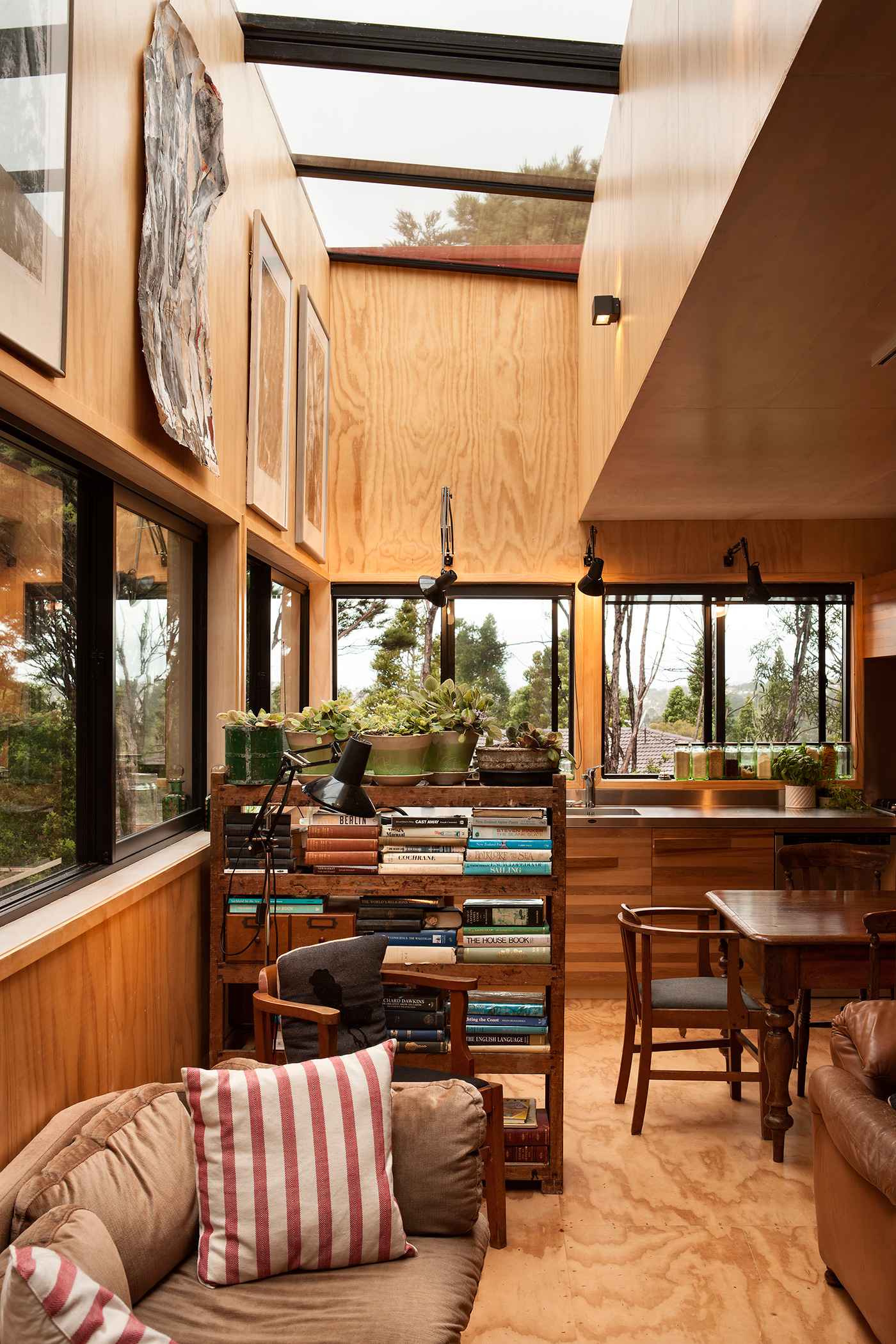 What steel is to the outside of the home, pine is to the interior. Akin to a shipping crate, the ceiling, floor and walls are all lined in ply. This humble material fits with the homeowners’ philosophy of leaving any pretension on the mat laid out in front of the re-purposed, black-lacquered front door. This is a house brimming with art and personality. “I am a maximalist,” laughs Janis. “I can spoil any space you let me into.”