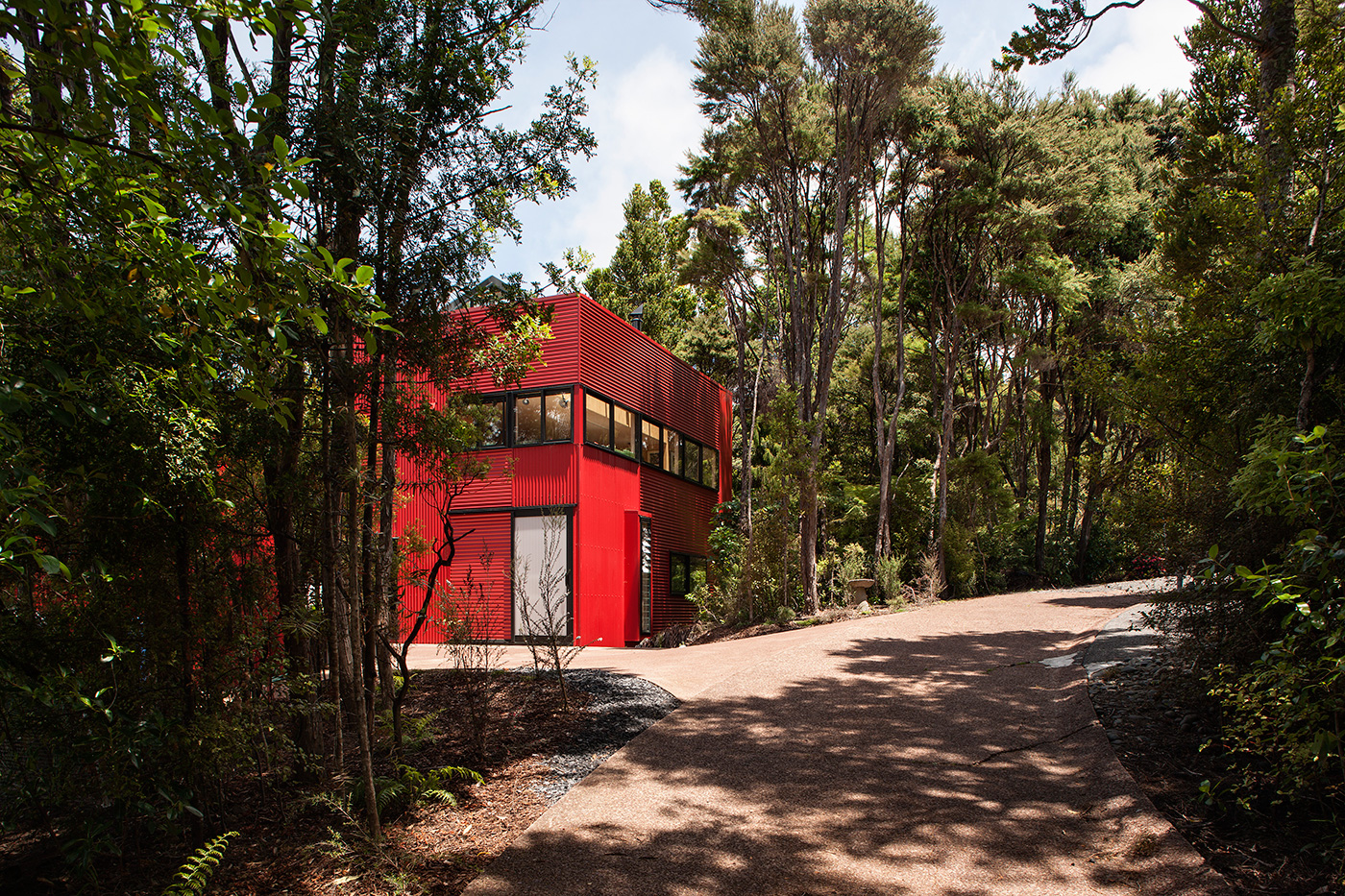 A homage to playfulness, this red cube on a Titirangi hillside is like a sculpture made with oversized Lego bricks. Its presence amid the greenery is surprising, yet the contrast somehow speaks of place – and almost everyone who visits is won over by its cheerful form and hue.