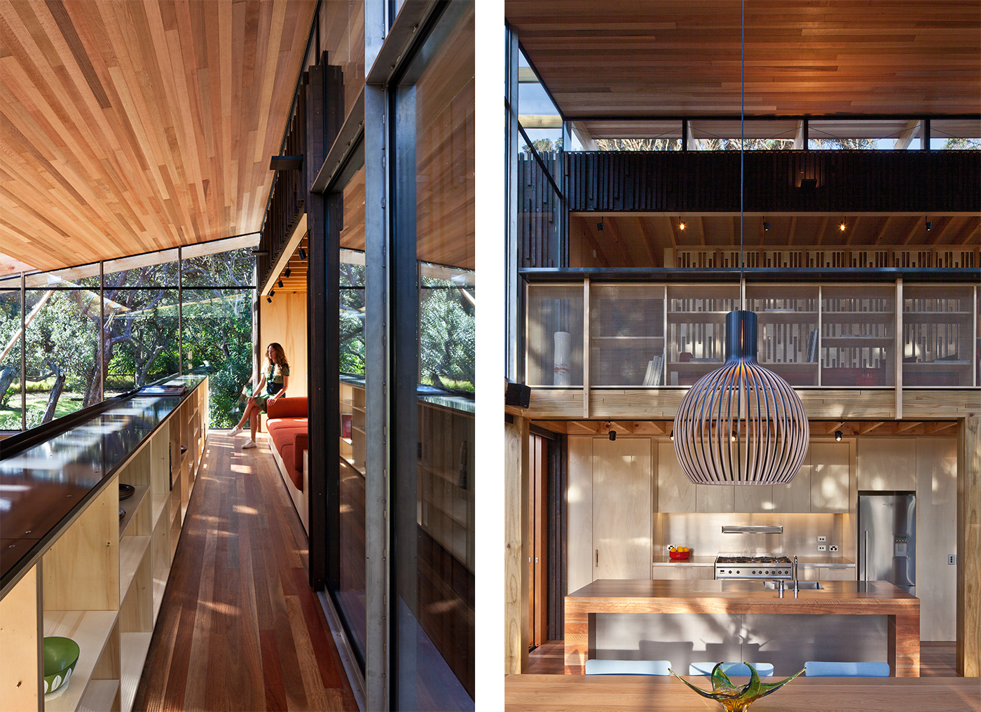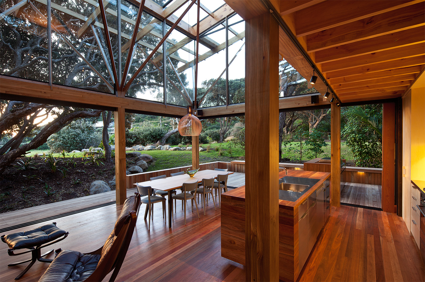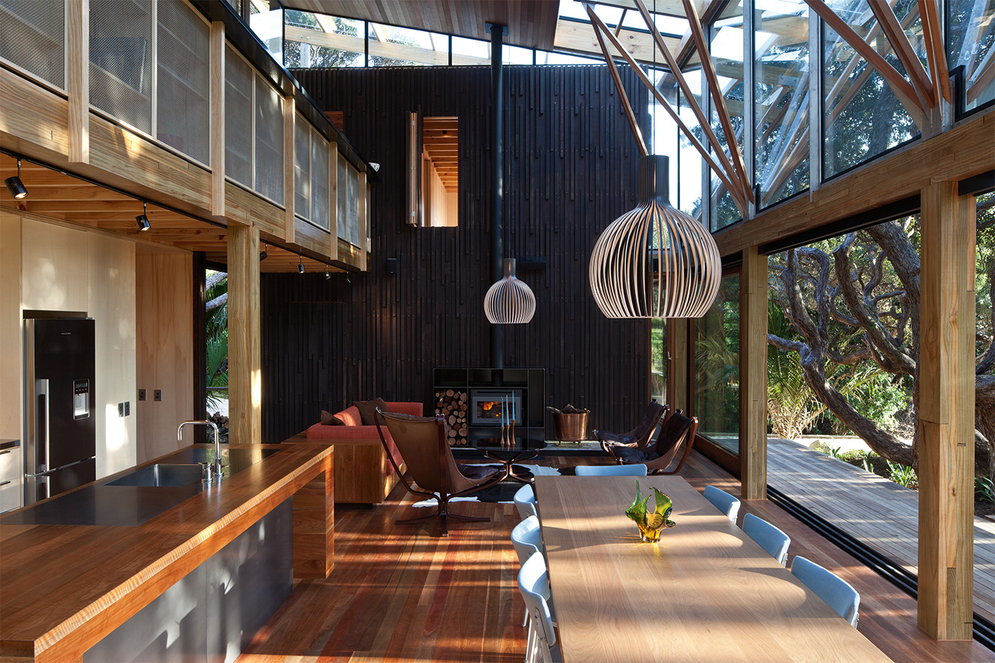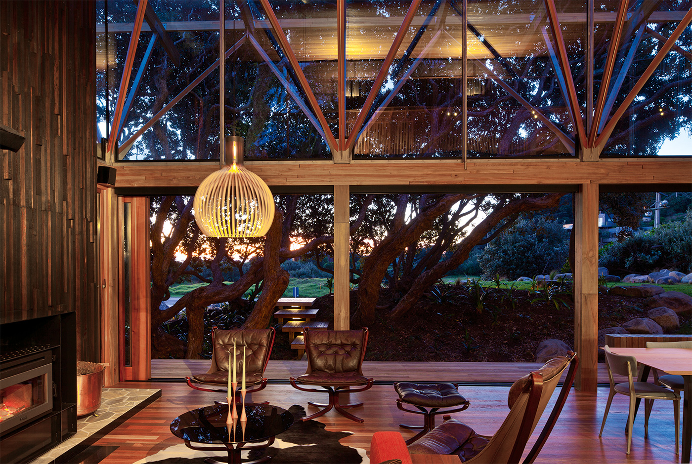 These blocks are clad in dark cedar boards with battens arranged in a pattern that loosely mimics pohutukawa bark, while the light poplar ply that lines their interiors suggests the hollowed-out timber inside the trees. Between these two forms is a lofty living, kitchen and dining area where the part-glass roof is dramatically held up by ethereal, painstakingly realised geometric branches of steel and timber. The views reach all the way to the top of the pohutukawa canopy.